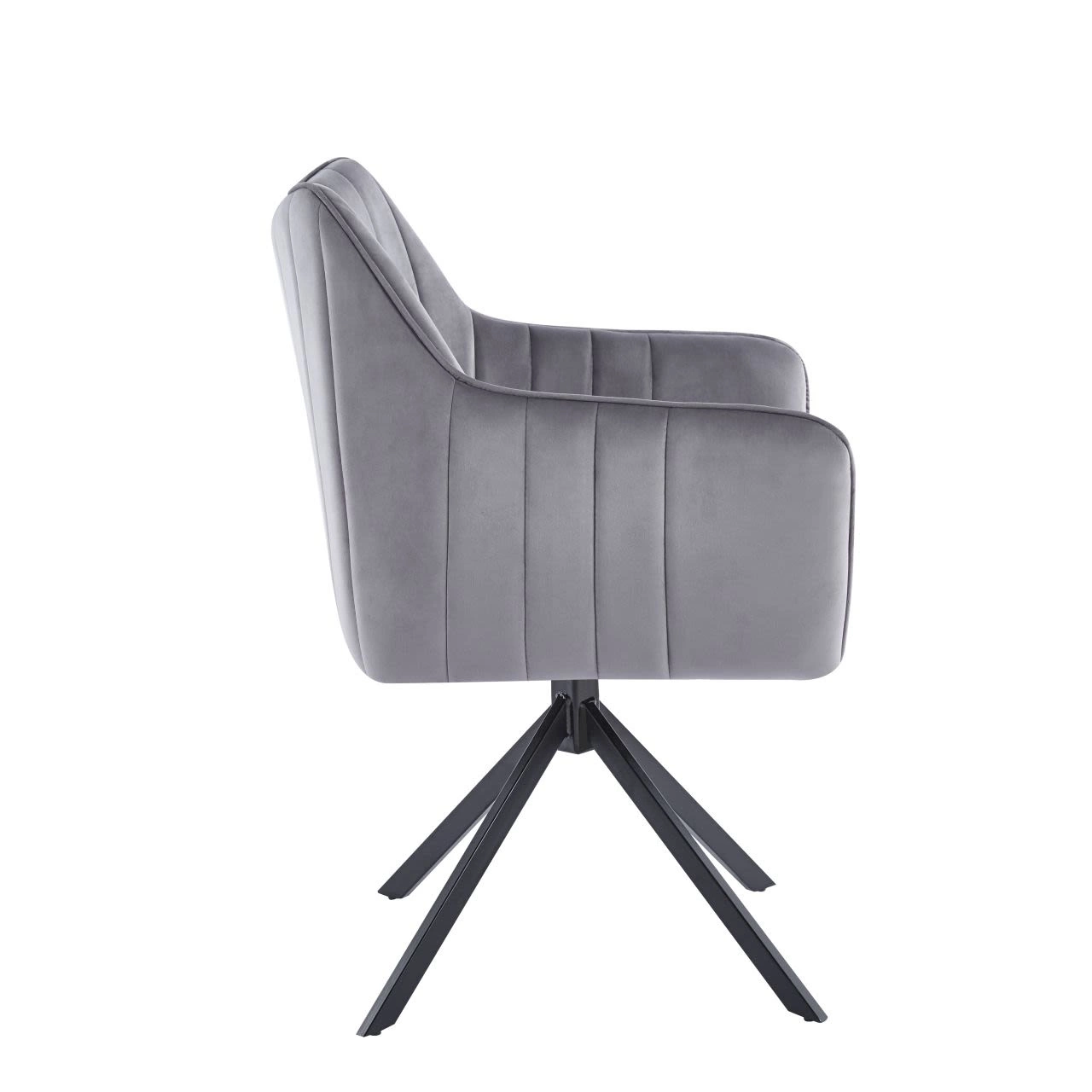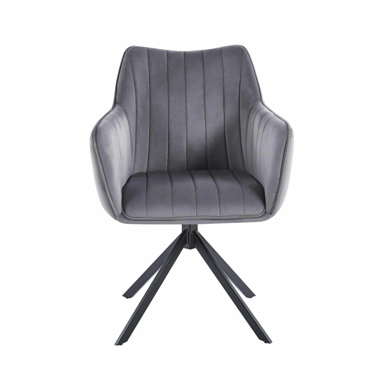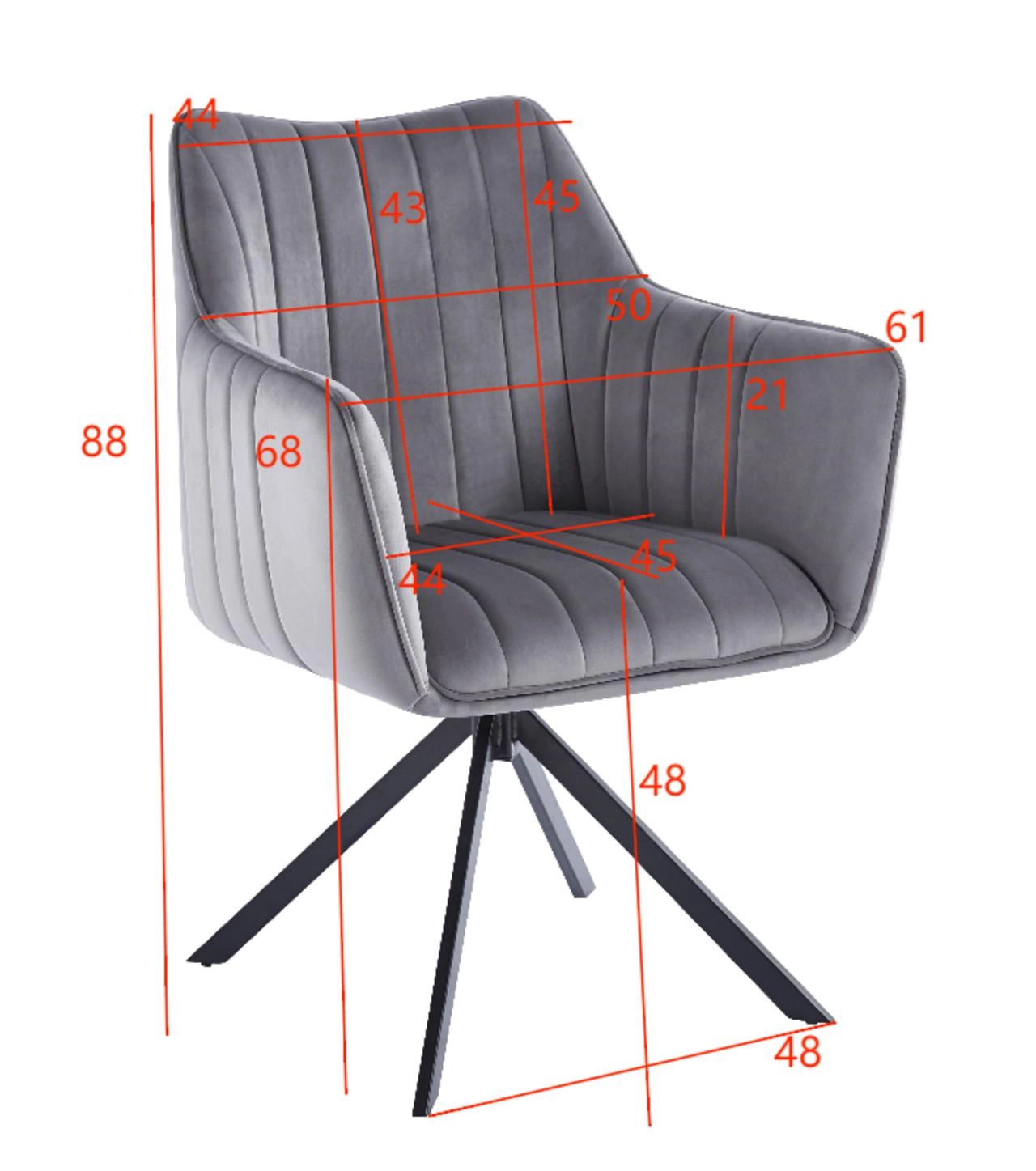 Otočná židle Adrienne Velvet od značky Intesi je elegantním řešením do jídelny i obývacího pokoje, které spojuje pohodlí s výrazným, moderním designem. Potah z měkkého šedého sametu, područky a stabilní černý základ na čtyřech kovových nohách dodávají interiéru styl a komfort. Díky otočné funkci a promyšleným rozměrům (celková výška 88 cm, šířka 61 cm, hloubka 45 cm) se židle skvěle hodí ke stolu, k toaletnímu stolku nebo pracovnímu stolu.