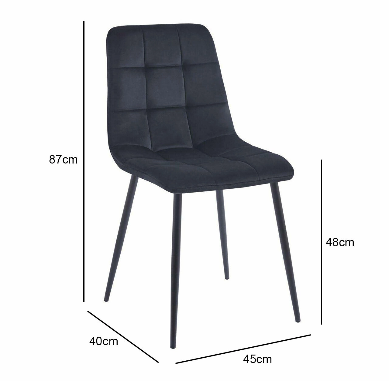 Jídelní židle Caro Velvet od značky Intesi je navržena s důrazem na moderní a elegantní interiéry. Čalounění z měkkého, prošívaného sametu v hluboké černé barvě ve spojení s tenkými kovovými nohami vytváří dokonalé propojení pohodlí a výrazného designu. Díky kompaktním rozměrům – výška 87 cm, šířka 45 cm, hloubka 40 cm – je ideální volbou jako židle do jídelny, kuchyně, obývacího pokoje nebo ke kosmetickému stolku.
