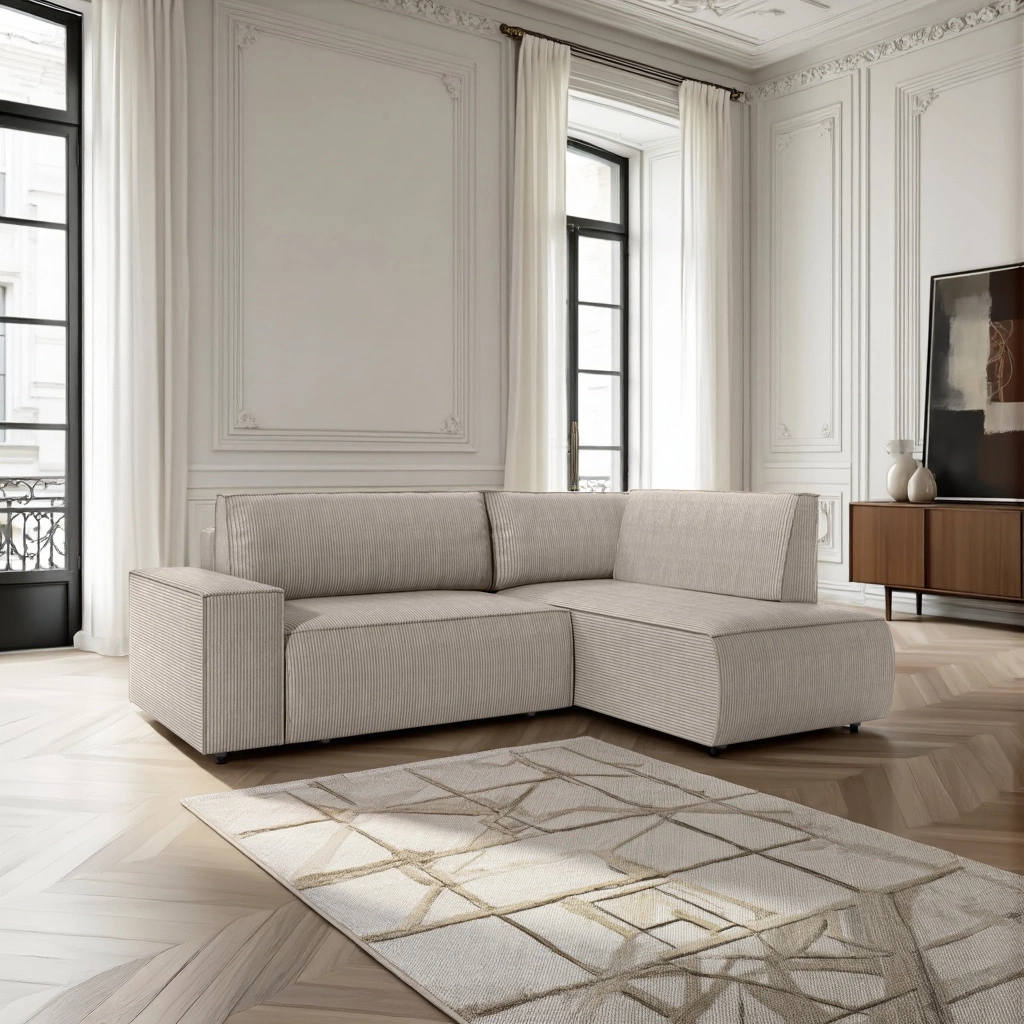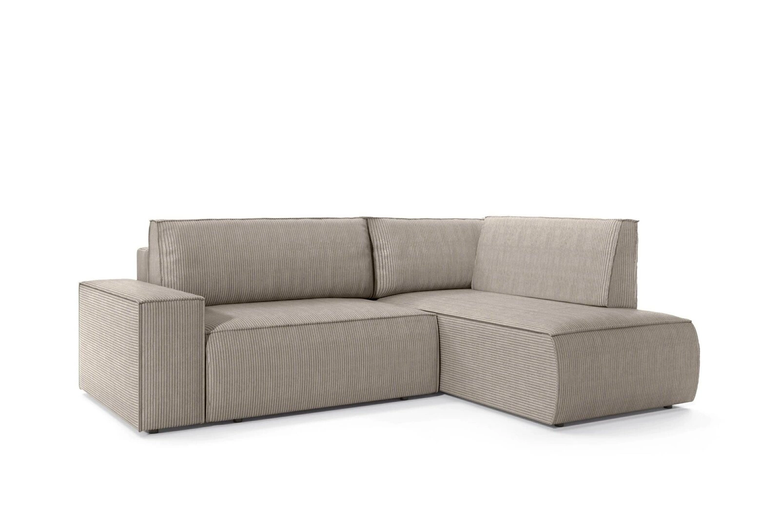 Rozkládací rohová sedačka Molde L od značky Intesi je moderní, pravostranná rohová pohovka z manšestrové látky v tmavě béžové barvě, navržená s ohledem na pohodlí a funkčnost vašeho obývacího pokoje. Perfektně kombinuje módní vzhled s praktickými řešeními: nabízí velkou spací plochu 200x135 cm a prostorný úložný prostor na lůžkoviny. Široké područky (28 cm) a měkký manšestr zajišťují každodenní relax, zatímco pevná konstrukce garantuje komfortní používání po dlouhá léta.