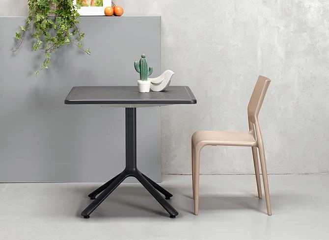 Minimalistický design v moderním stylu dělá ze stolu Eco skvělou volbu jak do domácího interiéru, tak i pro venkovní prostory. Odolný vůči proměnlivým povětrnostním podmínkám, je perfektní jako stůl na zahradu, balkon nebo terasu. Jemný antracitový odstín podtrhuje univerzálnost stolu a umožňuje snadné sladění s různými styly – od skandinávského až po industriální či loftový styl.