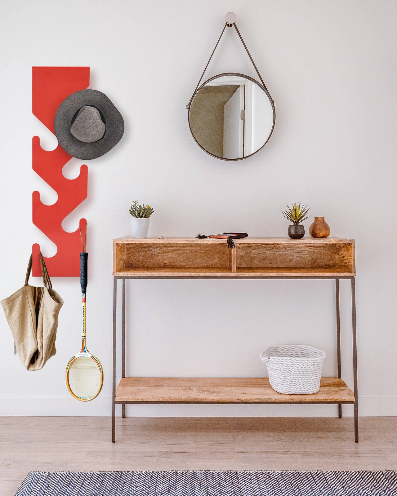 Cani není jen funkční věšák do předsíně, ale také designová nástěnná dekorace, která upoutá pozornost a podtrhne charakter vašeho interiéru. Intenzivní červená barva a geometrický tvar připomínající moderní sochu zaručují, že tento model skvěle zapadne do trendových, minimalistických či industriálních prostor. Lakovaný povrch zajišťuje odolnost a snadnou údržbu – stačí věšák otřít vlhkým hadříkem a vždy bude vypadat perfektně.