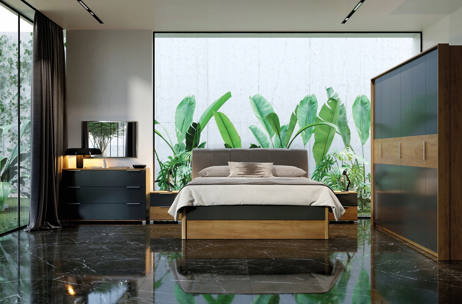 Přirozený odstín dubu v kombinaci se šedou dodává interiéru útulnost a moderní svěžest. Hladké, polomatné čelní plochy perfektně zapadají do oblíbeného skandinávského stylu, který snadno sladíte se světlými stěnami, dřevěnou podlahou či minimalistickými doplňky. Velké zrcadlo na středních dveřích nejen opticky zvětší prostor, ale také usnadní každodenní přípravy a šetří místo pro samostatné zrcadlo.