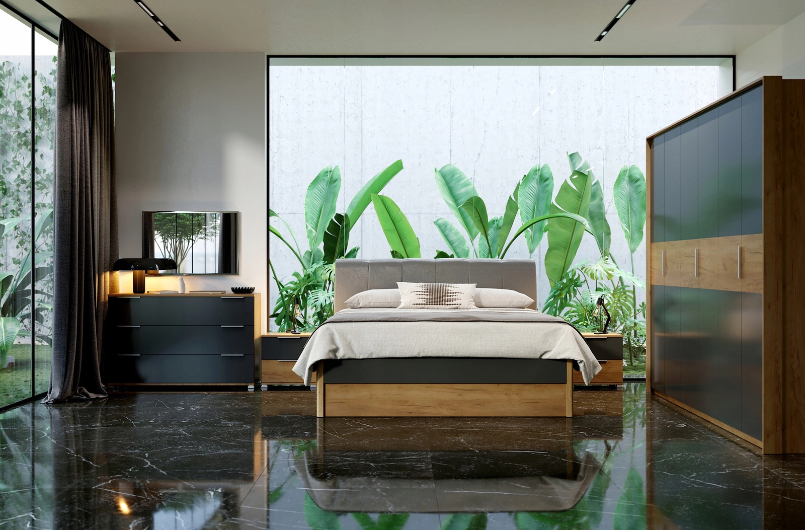 • Kombinace dubu craft a šedé – univerzální barevnost vhodná do různých interiérů