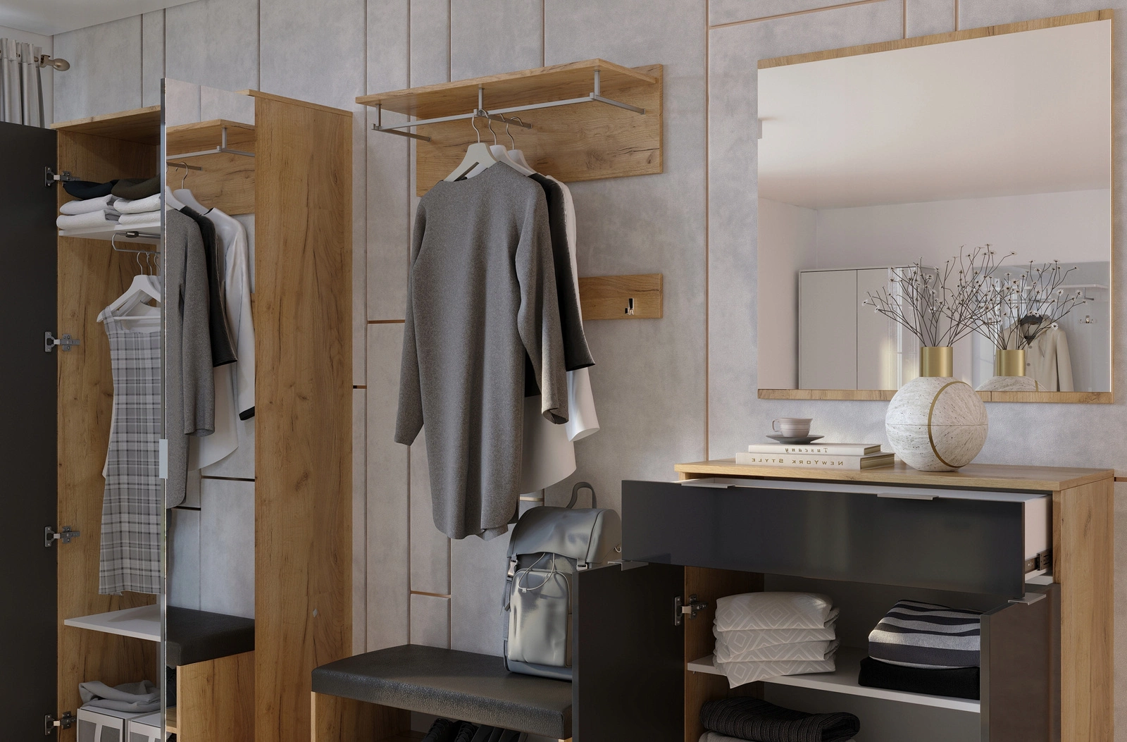 • Kombinace polic a tyče – flexibilní úložný prostor pro různé druhy oblečení a doplňků