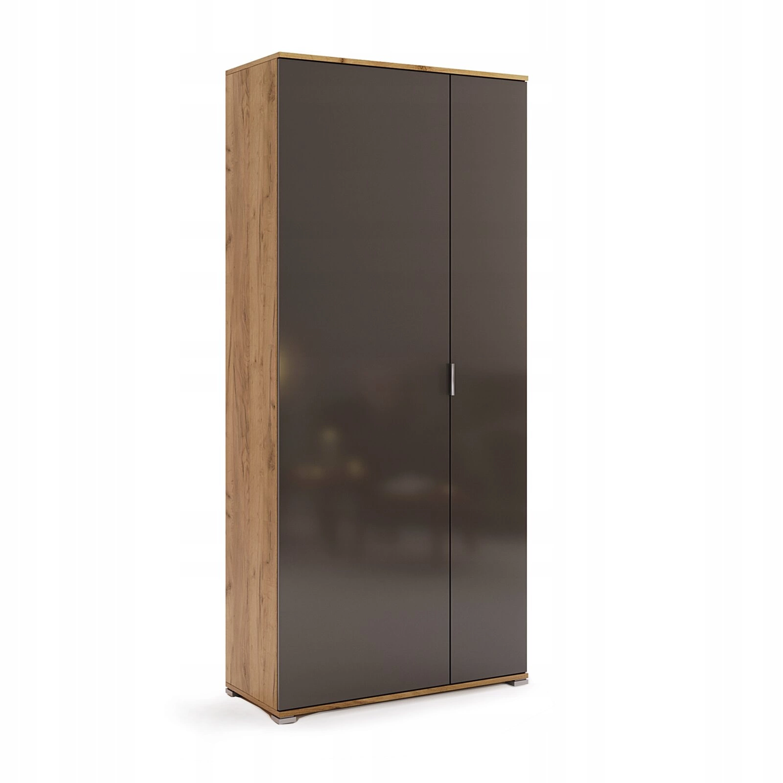 Šatní skříň Lana je praktickým a stylovým řešením pro uložení oblečení, které se skvěle hodí do moderních i skandinávských interiérů. Tento model o šířce 80 cm, výšce 199 cm a hloubce 40 cm je vybaven prostornými policemi a tyčí na ramínka, což zajišťuje pohodlné využití jak v ložnici, předsíni, tak i v dětském pokoji. Harmonická kombinace šedých dvířek s povrchem v odstínu přírodního dubu craft dodává skříni eleganci a vizuální teplo, zatímco lesklé provedení jemně odráží světlo a prosvětluje prostor.