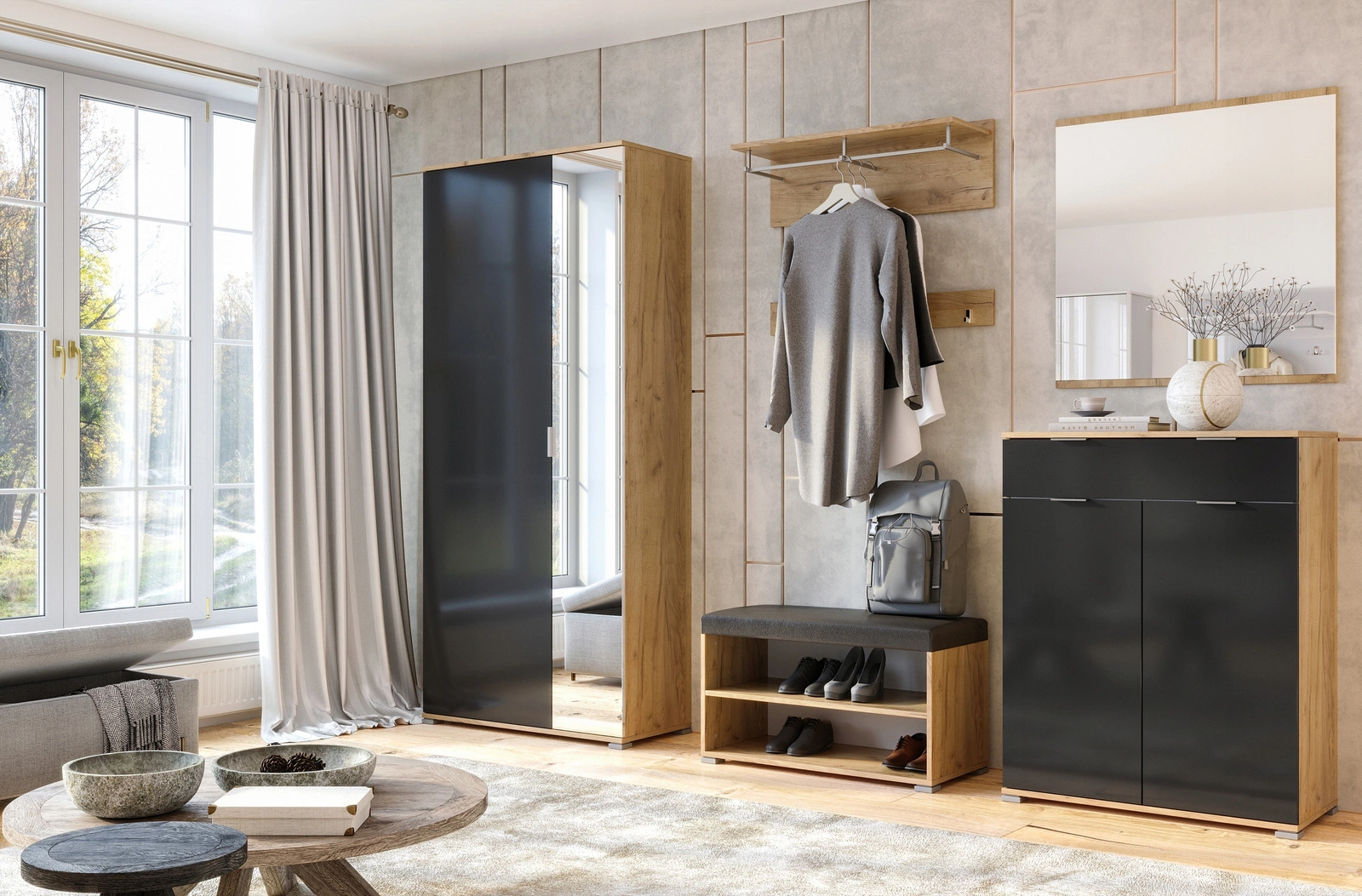 Šatní skříň Lana byla navržena s důrazem na praktičnost a stylový vzhled. Jednoduché, geometrické linie a hladké čelní plochy bez zbytečných ozdob perfektně zapadají do skandinávského stylu, který klade důraz na rovnováhu mezi funkčností a designem. Díky hloubce 40 cm bez problémů umístíte skříň i do menších prostor, například do úzké předsíně nebo malé šatny. Promyšlené uspořádání polic a tyče umožňuje pohodlně pověsit košile, kalhoty nebo šaty, a zároveň poskytuje dostatek místa na svetry, spodní prádlo i doplňky.