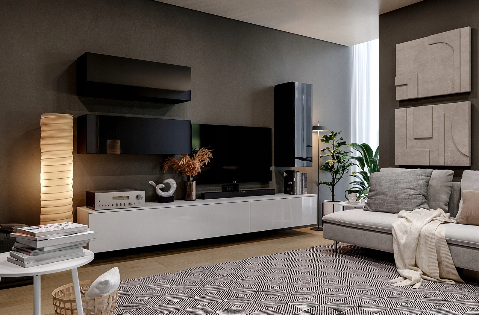 Minimalistický lesk – moderní závěsná TV skříňka do obýváku