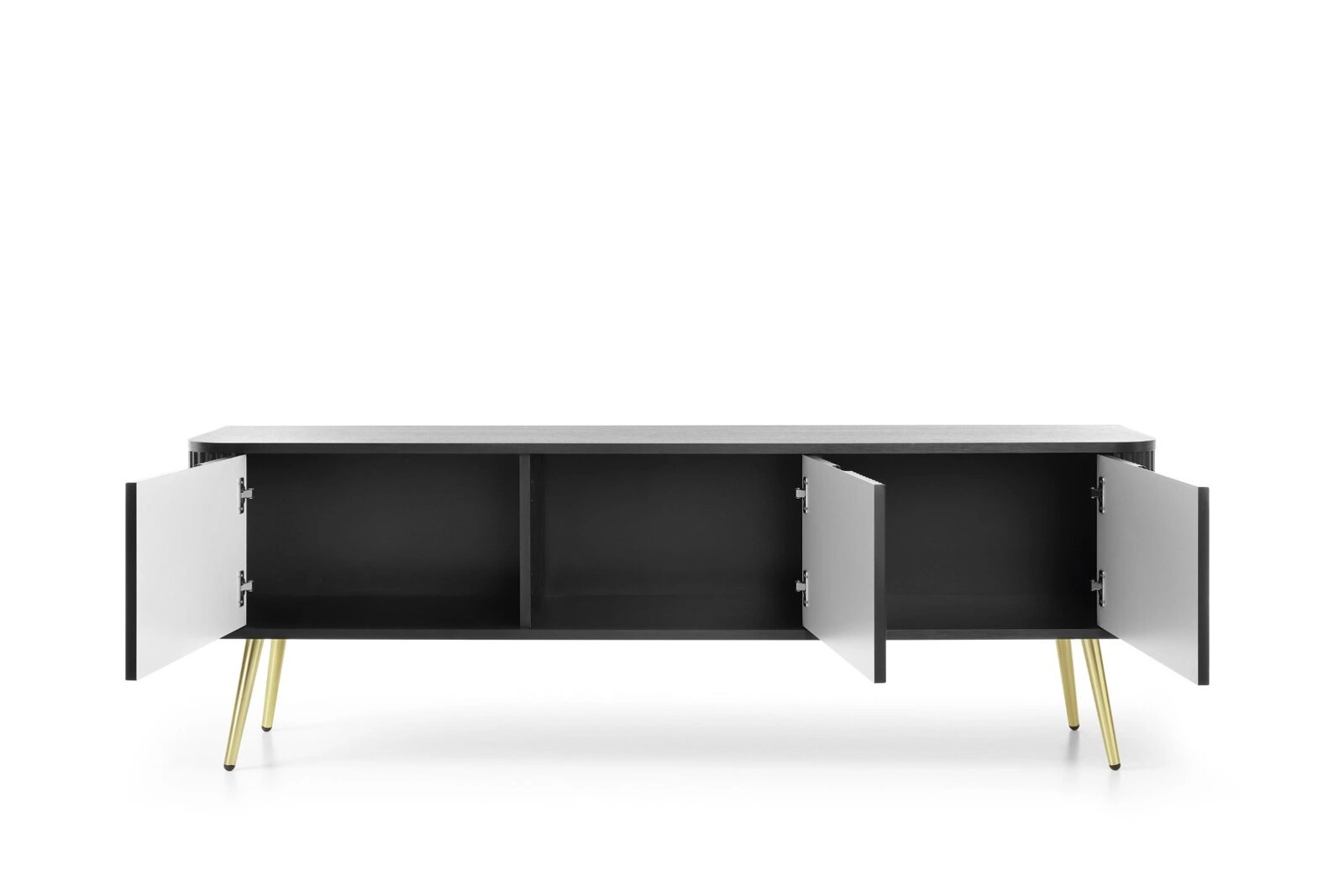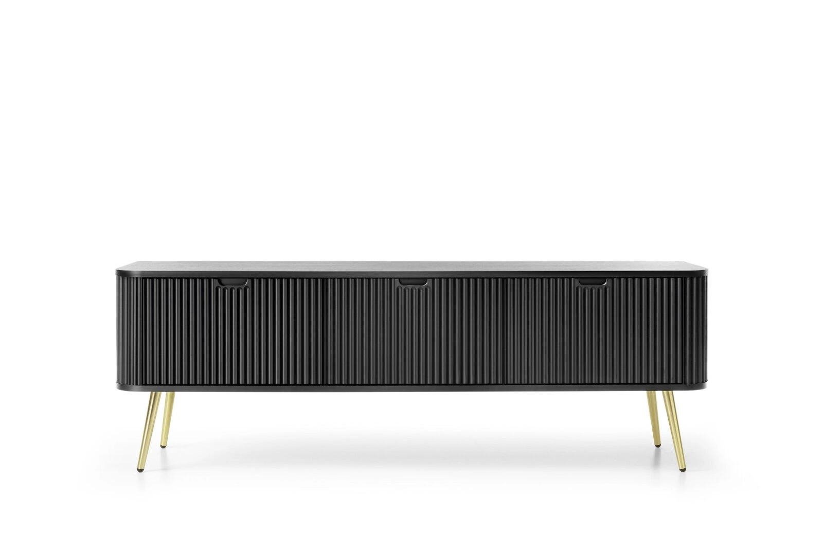 RTV komoda Seda od značky Intesi je moderní nábytek do obývacího pokoje, který zaujme elegantní černou barvou, frézovaným čelem a zlatými, štíhlými nohami. Šířka 188 cm a tři praktické police i skříňky zajišťují, že je ideální jako televizní stolek do prostorného interiéru. Vysoké kovové nohy dodávají lehkost a polomatné provedení čel podtrhuje prestižní charakter nábytku.