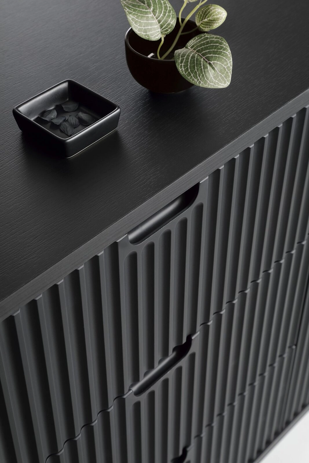 RTV komoda Seda je perfektní volbou pro milovníky moderních interiérů, kteří ocení spojení funkčnosti s originálním designem. Vertikálně frézované čelo dodává nábytku hloubku a jedinečnost, zatímco černé provedení v kombinaci se zlatými detaily přináší do místnosti nádech luxusu. Tento model skvěle zapadá do současných trendů obývacích pokojů a jednoduše ho sladíte s dalším moderním vybavením.