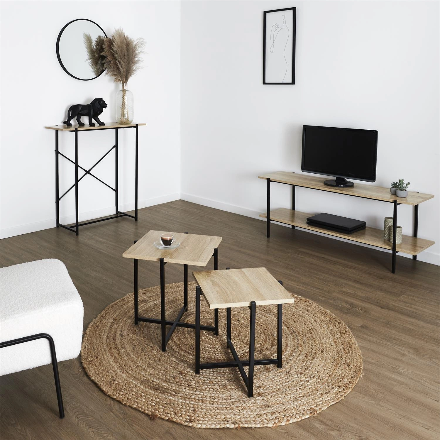 Desky stolků jsou vyrobeny z kvalitní MDF v přírodní barvě, takže jsou odolné proti poškrábání a snadné na údržbu. Pevná kovová podnož v černém polomatném provedení dodává nábytku stabilitu a charakteristický industriální vzhled. Kombinace těchto materiálů zaručuje, že sada Loka si zachová krásný vzhled po mnoho let používání, bez ohledu na intenzitu každodenního využívání.Proč si vybrat moderní sadu konferenčních stolků Loka?