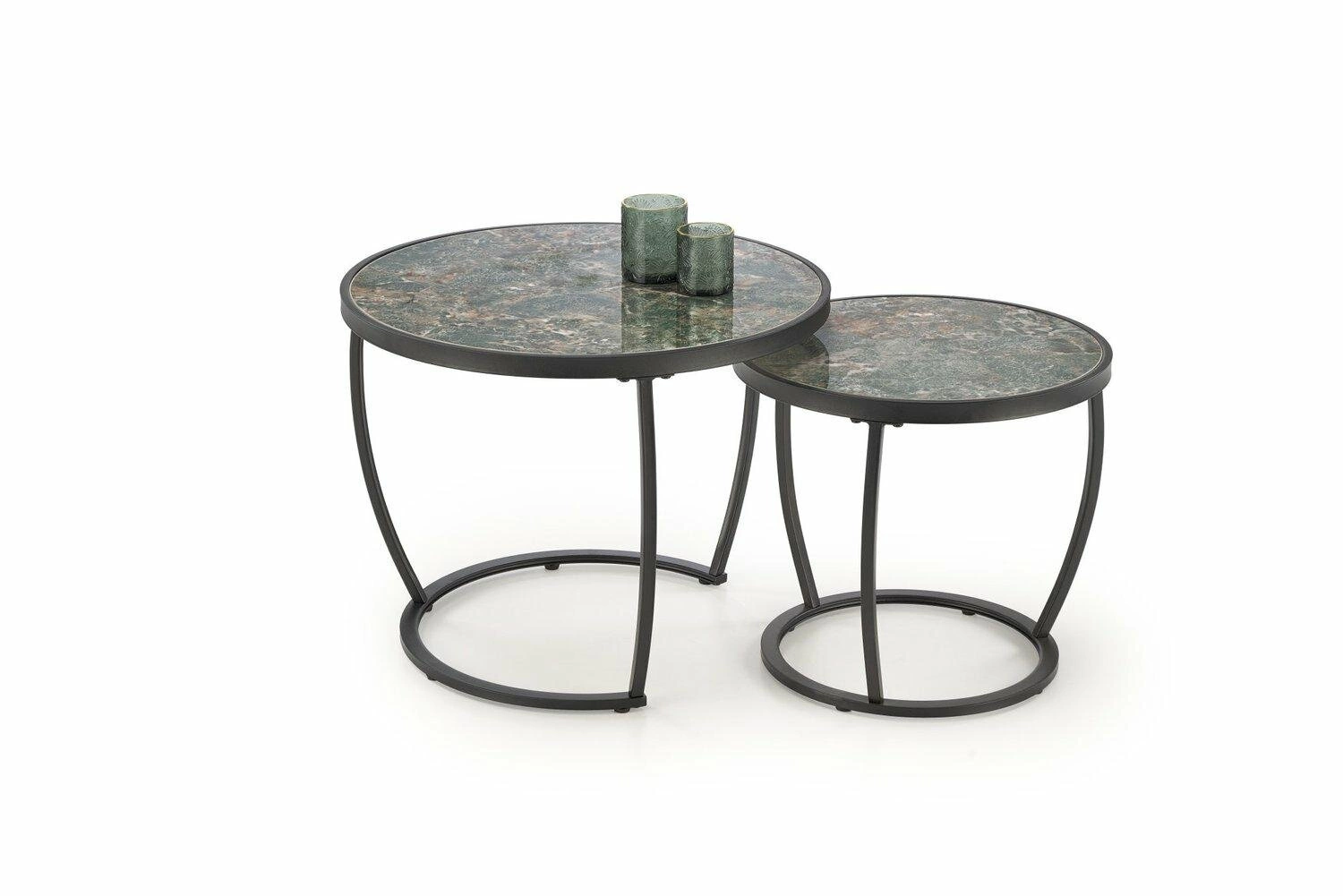 Sada 2 kulatých konferenčních stolků Sonja od značky Intesi je ideální volbou pro ty, kteří ocení moderní design a praktická řešení. Desky z dekorativního slinutého materiálu v odstínu zeleného mramoru o průměrech 62 cm a 47 cm jsou umístěné na stabilních černých ocelových podstavách, což zajišťuje nejen stylový vzhled, ale i pohodlné každodenní využití. Sada se perfektně hodí do obývacího pokoje nebo jídelny, kde může sloužit jako konferenční, odkládací nebo příruční stolek.Objevte designovou sadu konferenčních stolků Sonja
