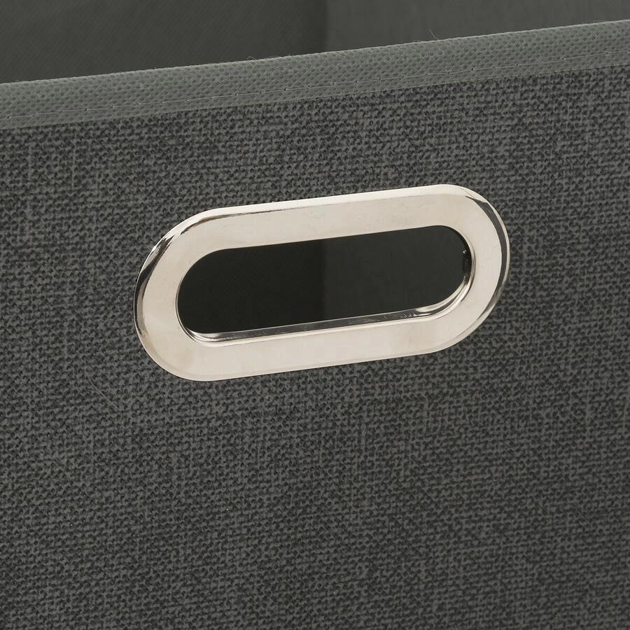 Box je opatřen otvorem, který slouží jako úchytka, takže se snadno přenáší a vyjímá z knihovny. Kovové okolí úchytu dodává boxu moderní vzhled a zajišťuje jeho dodatečnou odolnost. Dodává se ve dvou velikostech, které vyhovují různým organizačním potřebám a prostorům. Látka, kterou je box čalouněn, mu dodává elegantní vzhled a zároveň je příjemná na dotek. Je dokonalým řešením pro stylovou organizaci oblečení, doplňků nebo jiných předmětů.