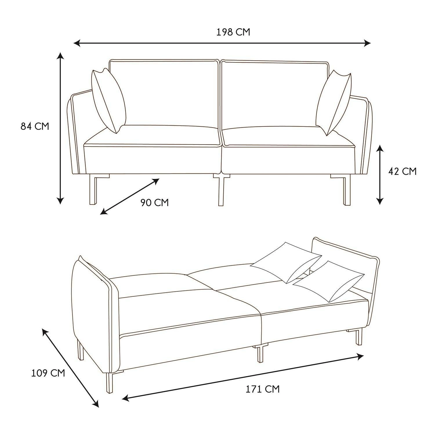 rozkládací Rozkládací pohovka Canif není jen pohovka, ale pohodlný kus nábytku se dvěma nezávislými opěradly, která si můžeme upravit podle vlastních preferencí. Pohovka Canif s šířkou necelé 2 metry je kus nábytku stvořený do garsonky nebo malého pokoje pro hosty. Spací plocha pohovky je: pohovka je čalouněna 100% polyetherovou látkou. Její vnitřní část je kombinací kovu a nábytkové desky. Pohovka nemá kontejner na lůžkoviny. Nohy pohovky jsou vyrobeny z kovu s černým práškovým nástřikem. Rozměry kartonu: rozměry: 92x111x44 cm. Hmotnost 45 kg.