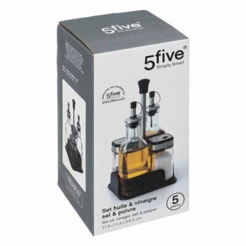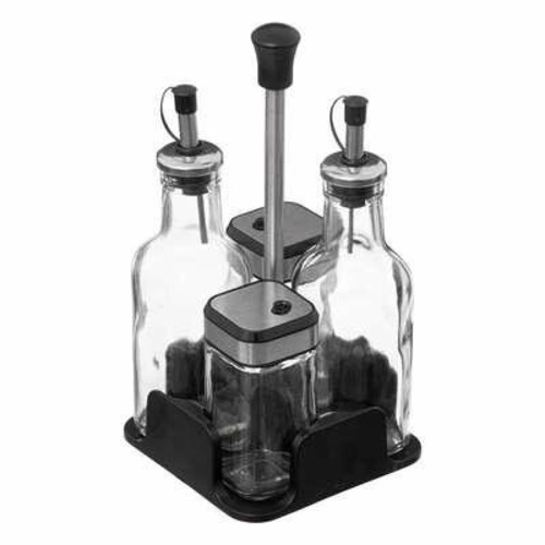 Sada koření, která se skládá ze 2 skleněných lahviček o objemu 160 ml a 2 skleněných dóz o objemu 100 ml, je ideálním řešením pro každou moderní kuchyni nebo restauraci. S touto sadou budete mít vždy po ruce veškeré potřebné koření - olej, ocet, sůl a pepř - a usnadníte si tak každodenní vaření a servírování. Lahvičky a sklenice jsou vyrobeny z vysoce kvalitního skla, které zajišťuje odolnost a elegantní vzhled. Stojan z plastu a nerezové oceli dodává celé sadě nejen moderní nádech, ale zajišťuje také stabilitu a pořádek.