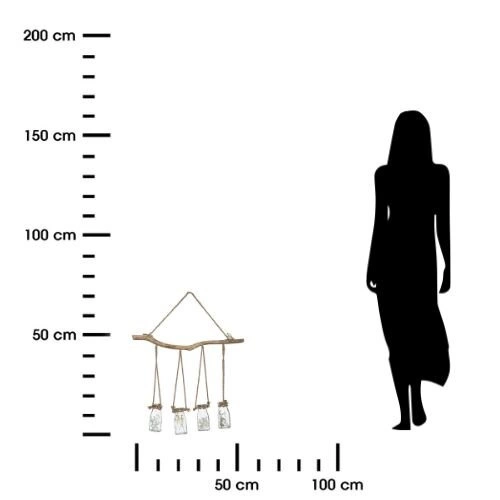 Atmosphera závěsná nástěnná dekorace se sušenými květinami je originální ozdobou na zeď, která propojuje průhledné sklo a přírodní dřevo v moderním designu. Kompozici tvoří čtyři skleněné lahvičky naplněné jemně vybranými sušenými květinami, zavěšené na efektní dřevěné liště o šířce 53 cm. Tento dekorativní prvek dodá každému interiéru svěžest, přírodní kouzlo i decentní eleganci.