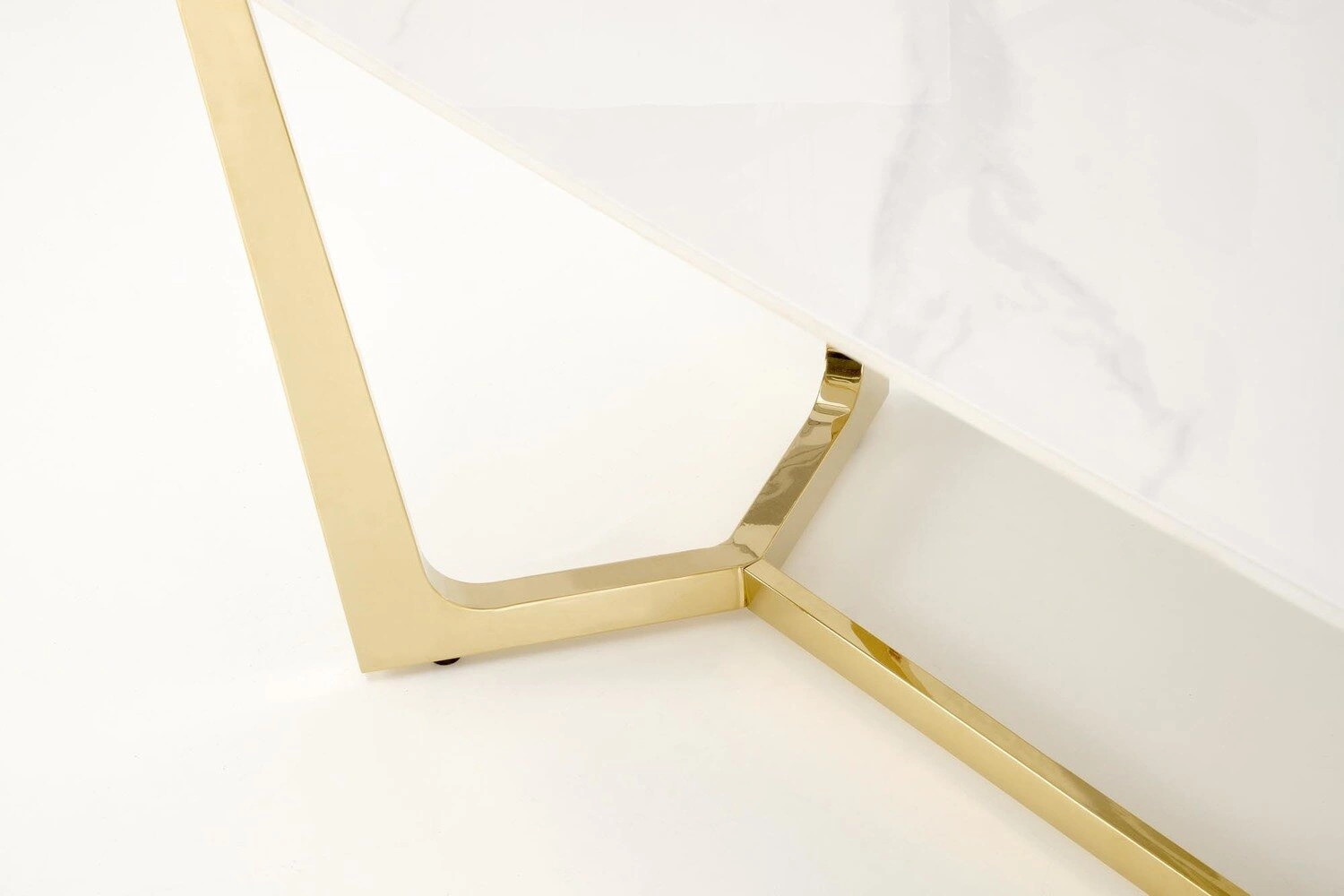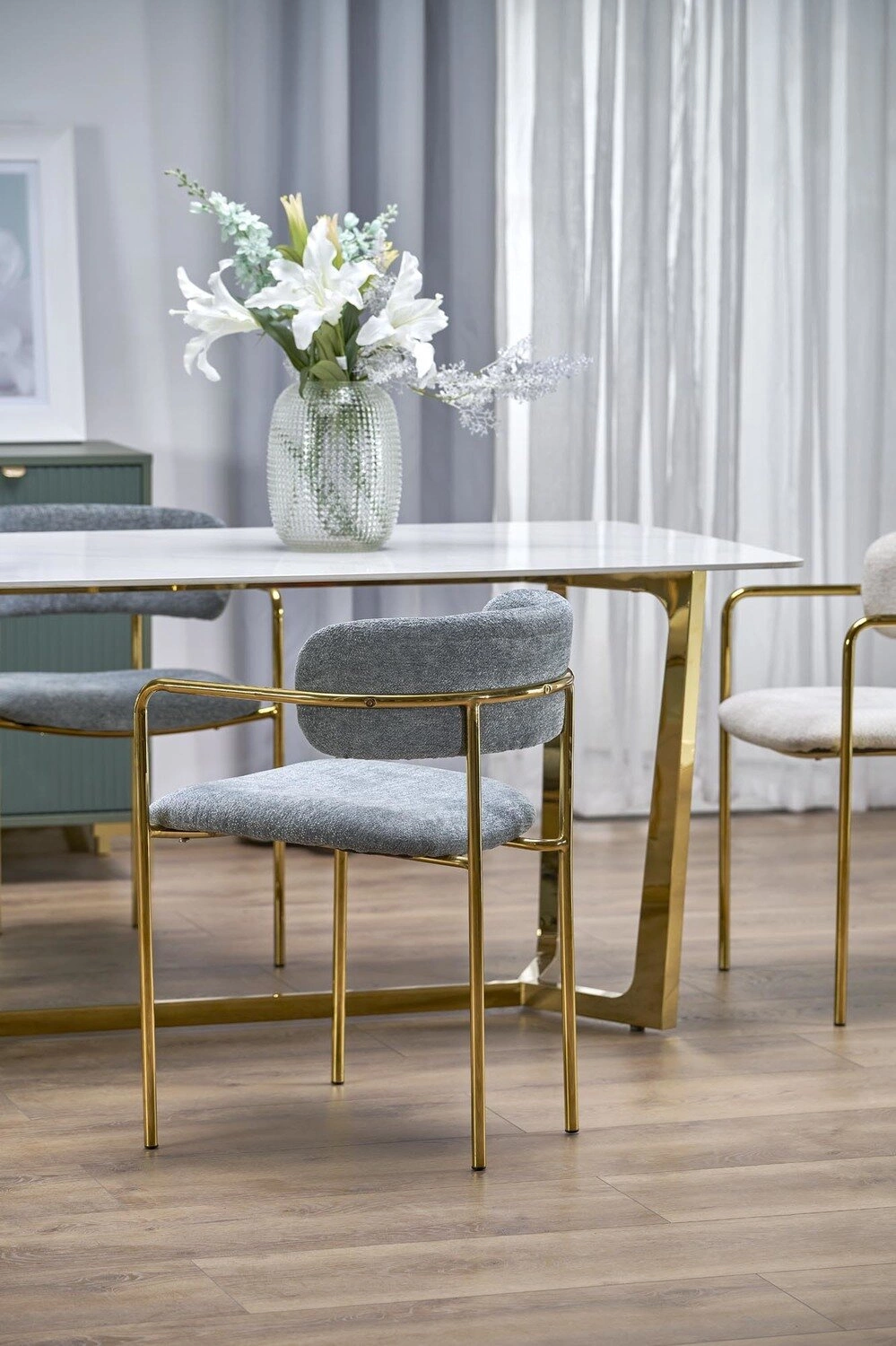 Vneste do svého interiéru sofistikovanou atmosféru s elegantním stolem Rohs Jeho obdélníkový tvar se zaoblenými hranami vyzařuje jemnost, zatímco nohy ve zlaté barvě dodávají jedinečný šmrnc. Vzhled dotváří slinutá deska v barvě mramoru, která stolu dodává nejen estetický půvab, ale také odolnost. Nechte stůl Rohs stát se srdcem vašeho prostoru, kde se styl snoubí s funkčností a vytváří jedinečnou atmosféru elegance.rozměry: 160/90/76/120 cm; materiál: slinutá / nerezová ocel, barva: deska - bílý mramor, nohy - zlatábalení 1: 173,00 x 103,00 x 9,00, 43,00 KGbalení 2: 81,00 x 72,00 x 34,00, 12,00 KG