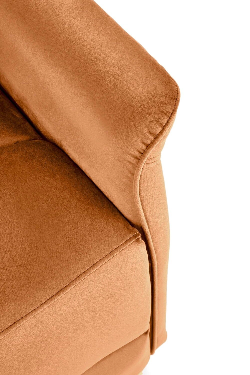 Skořicová barva křesla Karlin Velvet dodá vašemu interiéru útulnost a elegantní vzhled. Moderní tvar ušáku, jemné linie a černá základna na čtyřech pevných nohách skvěle zapadnou do současných interiérů, takže tento model je nejen praktickým, ale i stylovým křeslem do obývacího pokoje či ložnice. Sametové provedení zvýrazňuje exkluzivní charakter nábytku a láká k delšímu odpočinku.