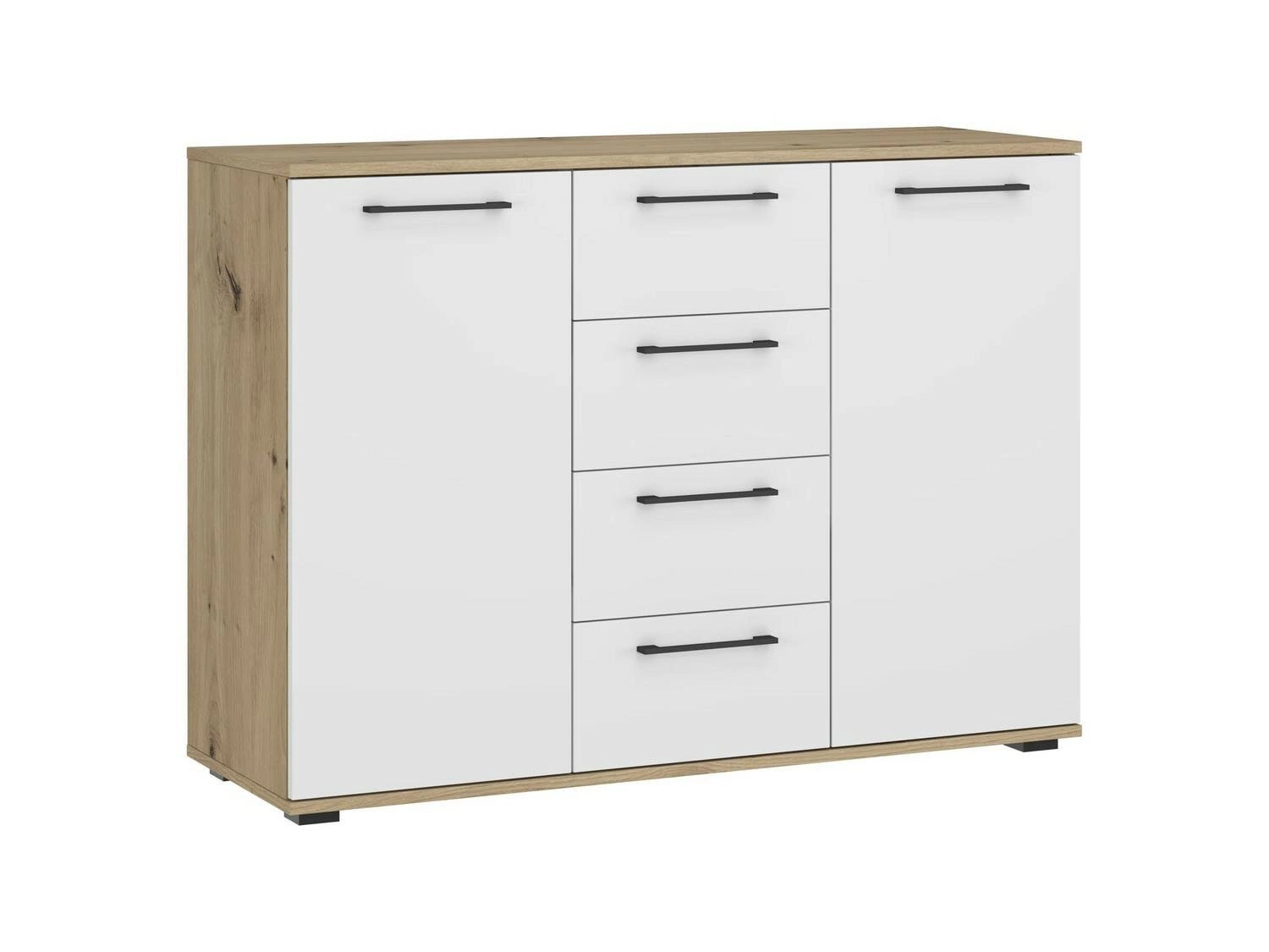 - Kombinace teplého odstínu dubu artisan s bílými čely dodává komodě moderní a elegantní vzhled, který snadno zapadne do různých stylů interiéru
