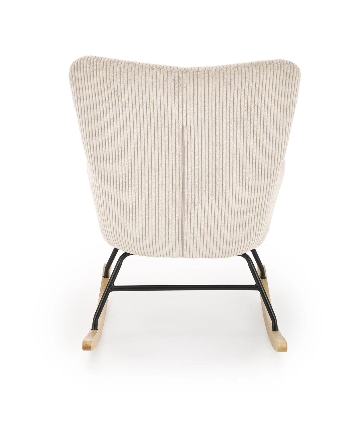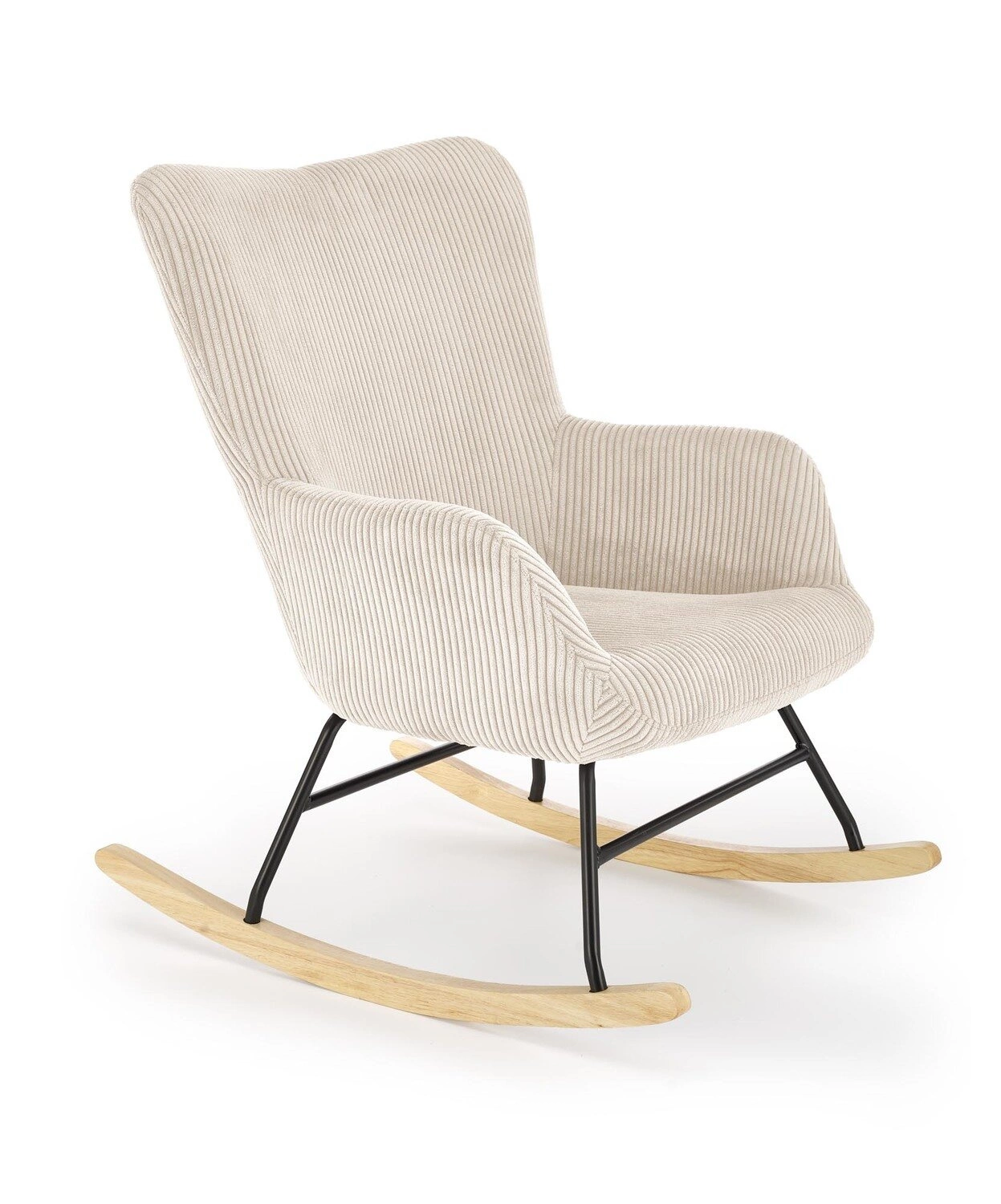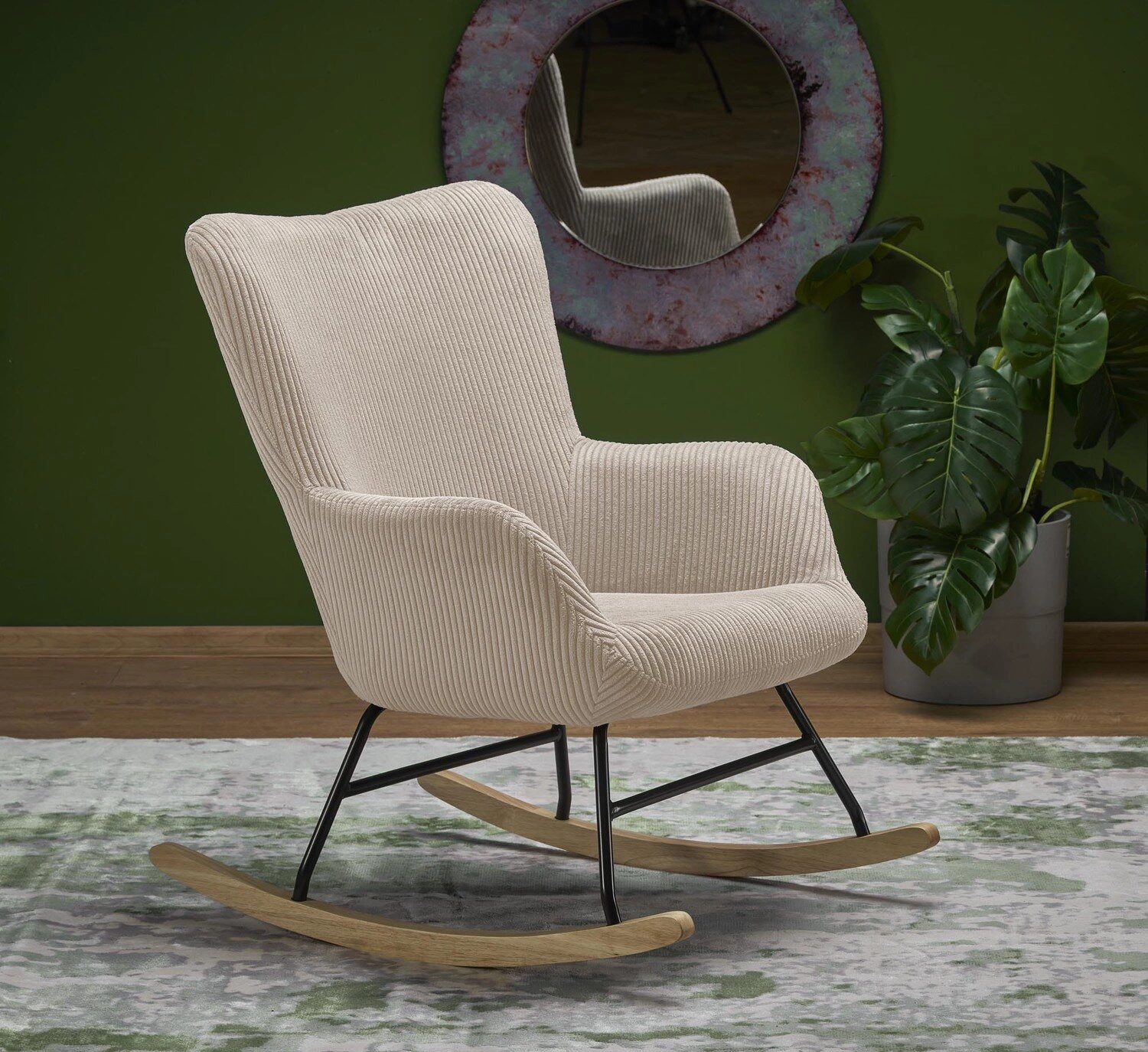 Krémové houpací křeslo Donelia okouzlí přírodní barvou a jemnou strukturou manšestrové látky Hyper, která dodává interiéru útulnost a volnost. Výrazné prošití a typický tvar ušáku podtrhují boho inspiraci, která se skvěle hodí do světlých, přátelských interiérů. Díky matnému povrchu a dřevěným prvkům v přírodním odstínu toto křeslo do obýváku perfektně doplní prostor zaměřený na lehkost a harmonii.