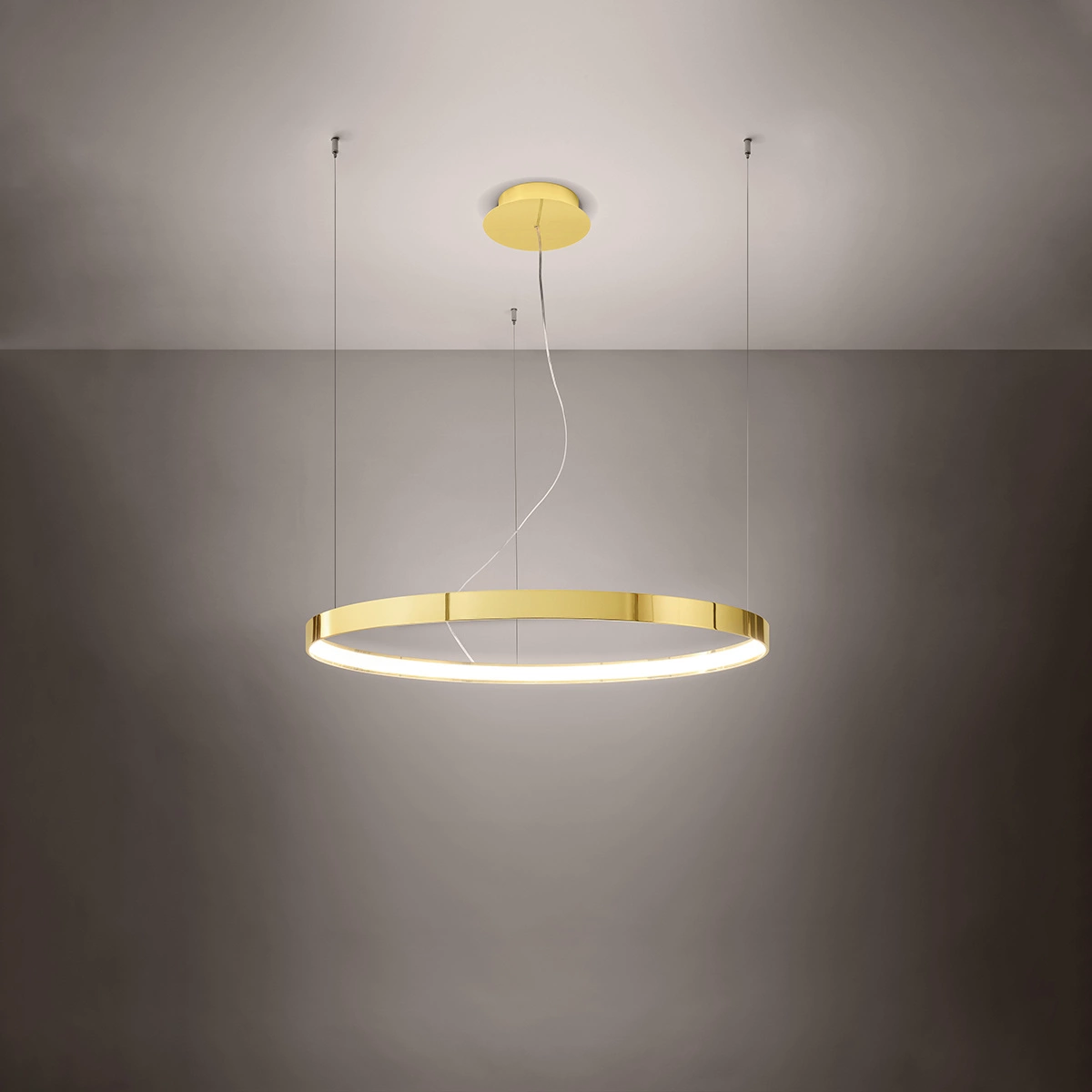 LED lustr Thoro RIO 78 je symbolem moderní elegance ve zlatém provedení, navržený pro stylové osvětlení obývacího pokoje, jídelny nebo kuchyně. Vyrobený z odolného hliníku, zaujme minimalistickým designem a působivým průměrem 78 cm. Díky integrovanému LED modulu o výkonu 50W a teplé barvě světla (3000K) poskytuje rozptýlené, příjemné osvětlení, které krásně podtrhne atmosféru vašeho interiéru.