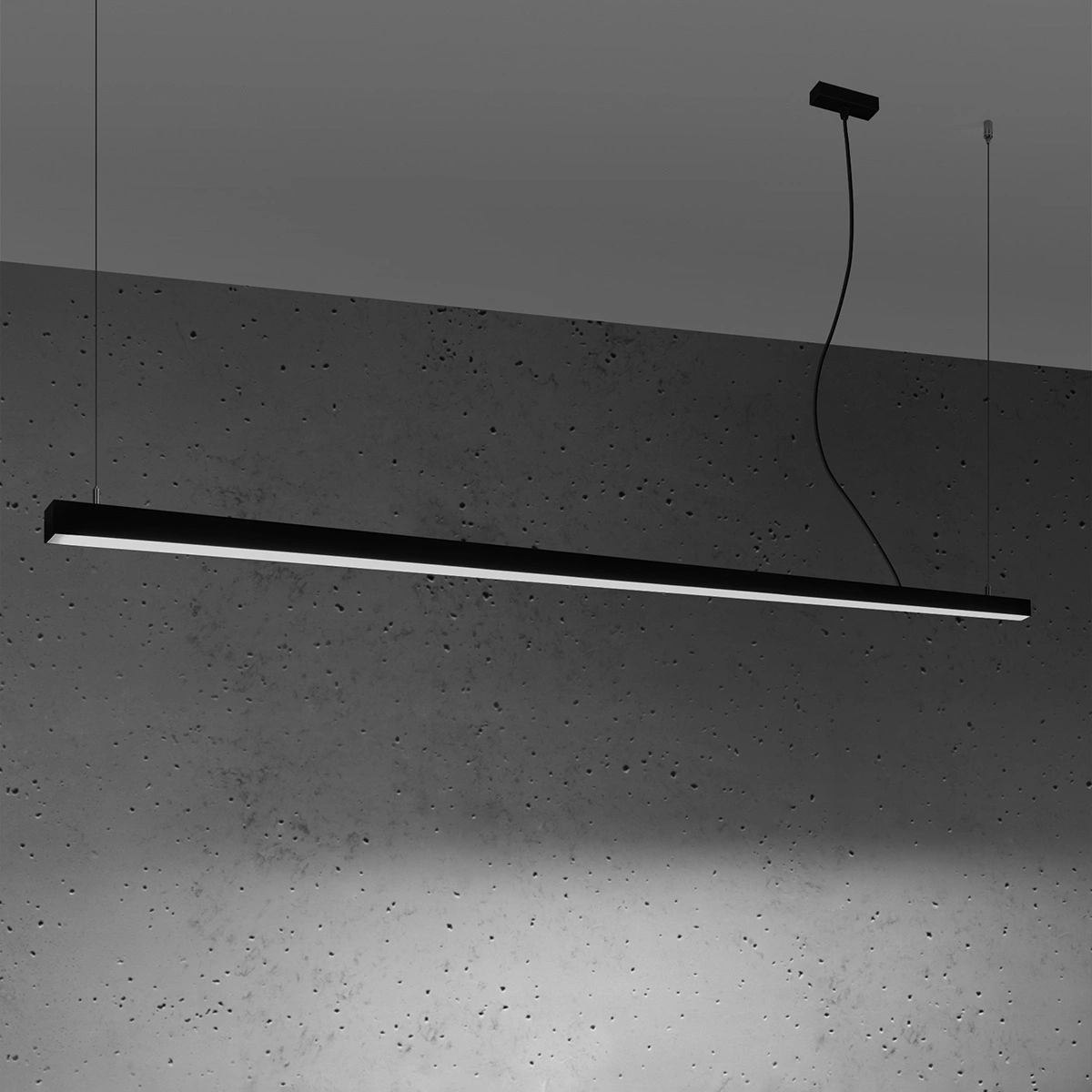 Závěsné svítidlo PINNE 200 od značky Thoro je minimalistické řešení o délce až 200 cm, vyrobené z odolného hliníku v hlubokém, matném odstínu černé barvy. Je vybaveno úsporným LED modulem 50W, který poskytuje jasné a přirozené světlo s teplotou chromatičnosti 4000K a působivým výkonem 6500 lumenů. Tento moderní stropní lustr je ideální jako lampa nad stůl, do obývacího pokoje, jídelny, kuchyně nebo kanceláře, kde perfektně osvětluje prostor a podtrhuje moderní, uspořádaný charakter interiéru.