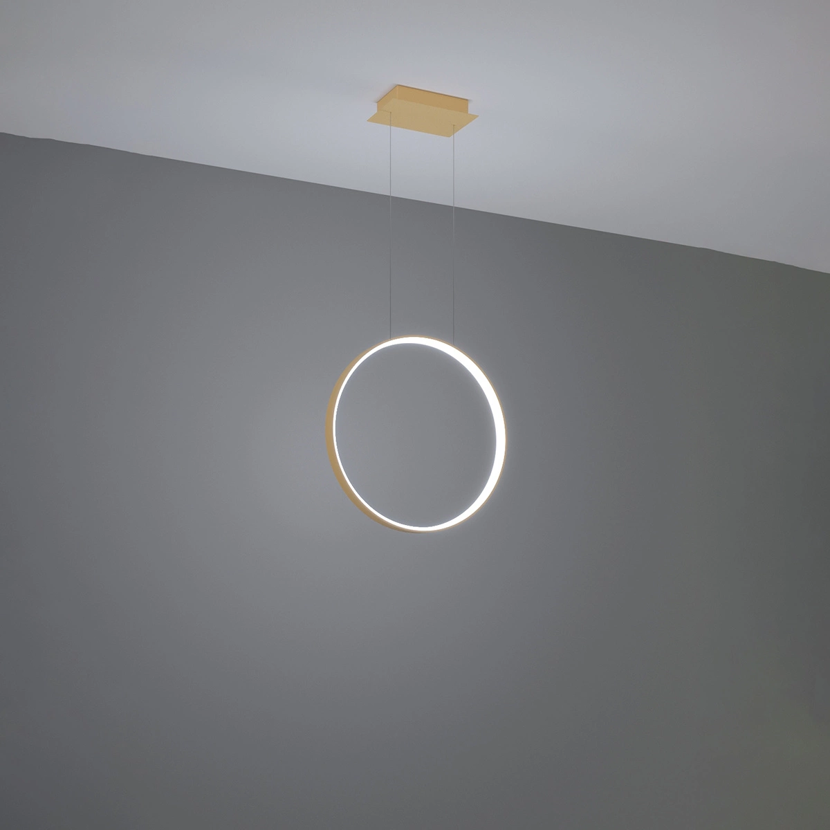 Závěsné LED svítidlo RIO 55 od značky Thoro představuje moderní stropní osvětlení, které spojuje minimalistický design s elegancí zlatého hliníku. Díky průměru 55 cm a působivé výšce až 150 cm je tento designový LED lustr ideální volbou jak do obývacího pokoje, tak nad jídelní stůl. Integrovaný LED zdroj o výkonu 30W (3870 lumenů, neutrální barva světla 4000K) zajišťuje jasné a rovnoměrně rozptýlené osvětlení, které se stane výrazným prvkem každého moderního interiéru.