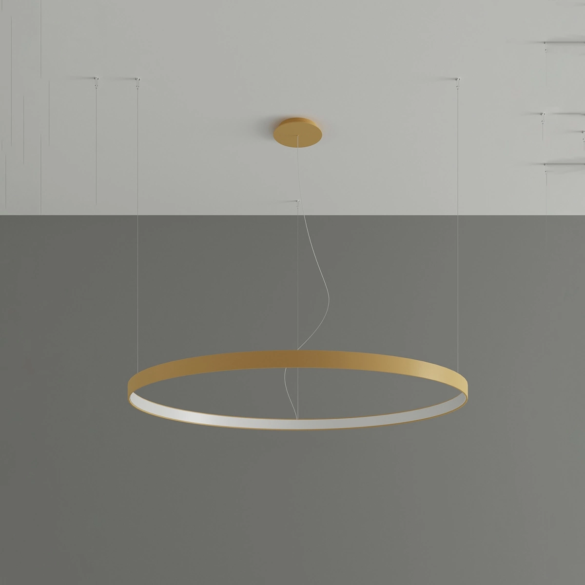 LED lustr Thoro RIO 110 je moderní stropní svítidlo s působivým průměrem 110 cm, vyrobené z kvalitního hliníku v elegantní zlaté povrchové úpravě. Nabízí rozptýlené, neutrální LED světlo (4000K), které je ideální do obývacího pokoje, jídelny nebo nad stůl v kuchyni. Zajišťuje pohodlné osvětlení a podtrhuje jedinečný charakter vašeho interiéru.