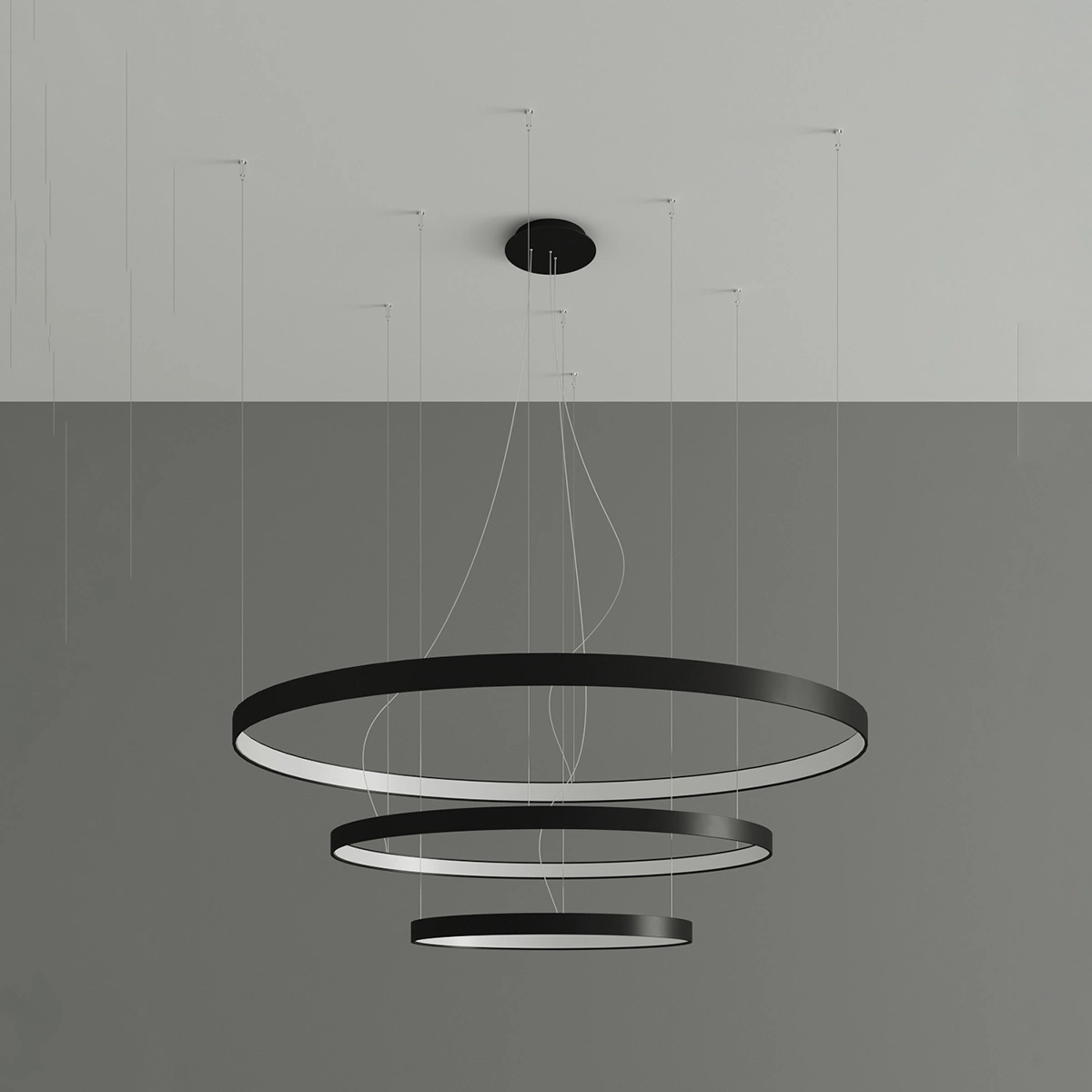 RIO 3 je LED lustr do obývacího pokoje nebo jídelny, který okamžitě vynikne mezi závěsnými svítidly. Tři decentně propojené kruhy o průměru celých 110 cm vytvářejí efektní kompozici a dodávají interiéru eleganci i moderní vzhled. Černé, matné hliníkové tělo skvěle zapadne jak do minimalistických, tak industriálních aranžmá. Transparentní kabel zajišťuje, že stropní lampa působí lehce a nepůsobí těžkopádně ani v místnostech s nižším stropem.