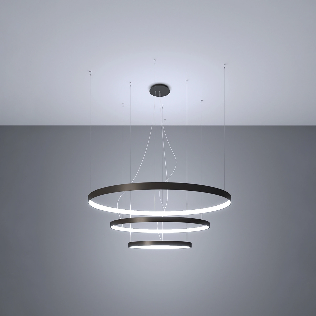 LED lustr RIO 3 černý je perfektním řešením jako lampa nad jídelní stůl, lustr do obýváku nebo působivé svítidlo nad kuchyňský ostrůvek. Skvělý poměr velikosti a intenzity světla umožňuje dokonale osvětlit relaxační zónu nebo rodinné centrum domova. Výška 150 cm umožňuje snadné přizpůsobení lustru rozložení místnosti a univerzální černá barva se skvěle hodí k různým stylům interiéru.