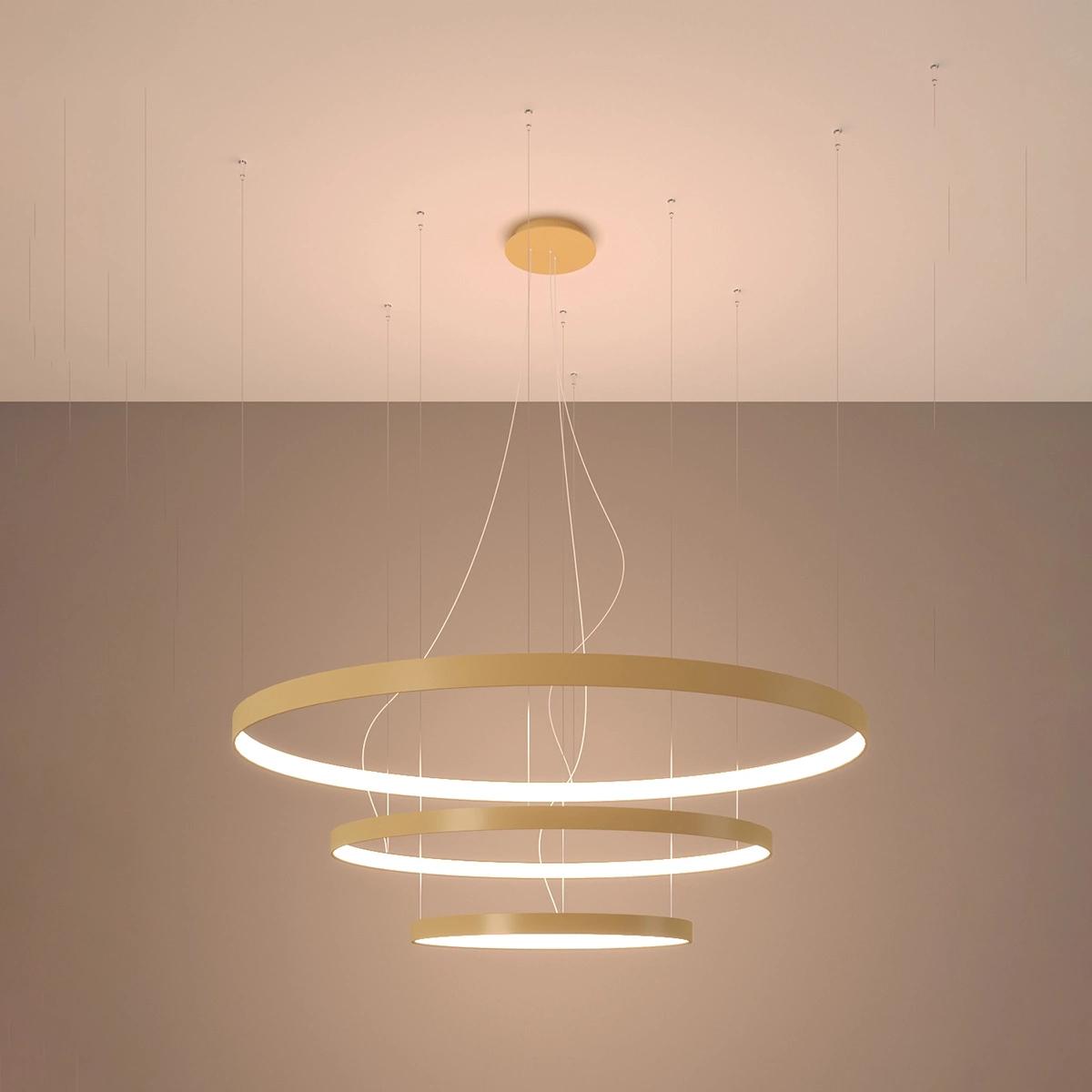Moderní lustr do obývacího pokoje a jídelny RIO 3 zaujme jemnou formou a luxusním provedením. Zlatá konstrukce dodává interiéru nádech elegance a vytříbenosti, skvěle ladí jak se světlými, tak tmavšími barvami stěn či nábytku. Široký průměr 110 cm zaručuje, že závěsné svítidlo bude výraznou dekorací i ve větších prostorech, upoutá pozornost a navodí útulnou atmosféru při společných chvílích u stolu.