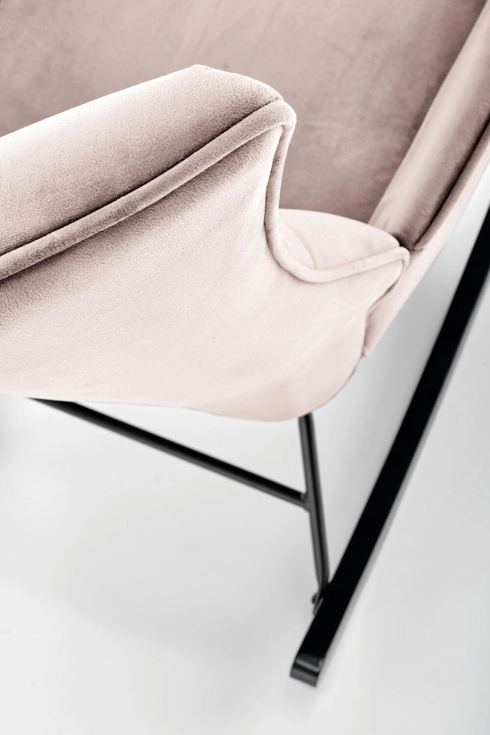 Výjimečná funkce houpání umožňuje uvolnit se po náročném dni a nabízí jemný, uklidňující pohyb. Houpací křeslo Topar je ideální jako místo ke čtení oblíbené knihy, odpolednímu odpočinku nebo příjemným rozhovorům s blízkými. Béžový samet dodává křeslu nejen eleganci, ale také zajišťuje měkkost sedáku, což zvyšuje komfort při dlouhodobém používání. Pevné kovové lyžiny v černé barvě poskytují stabilitu a dlouhou životnost – proto vám bude křeslo sloužit po mnoho let.