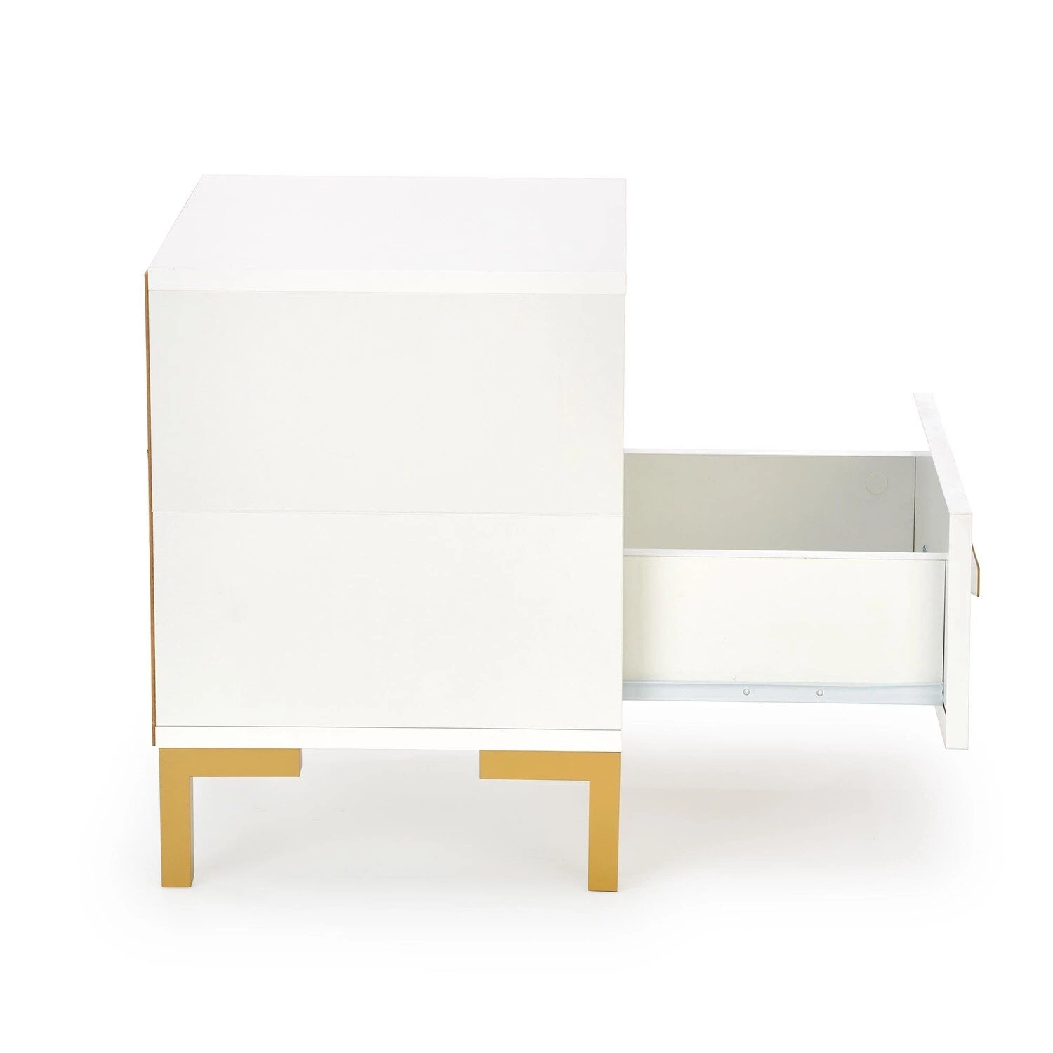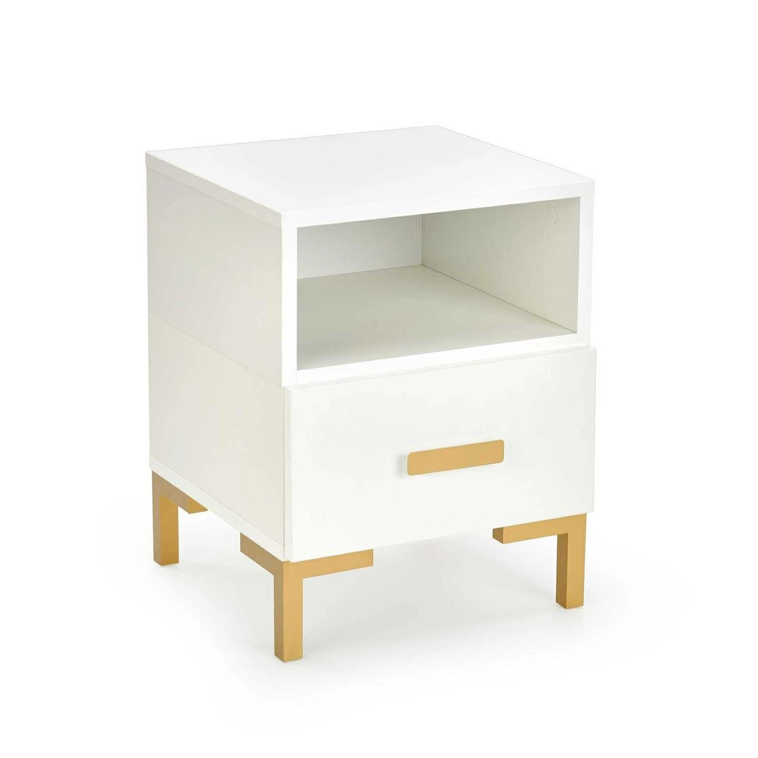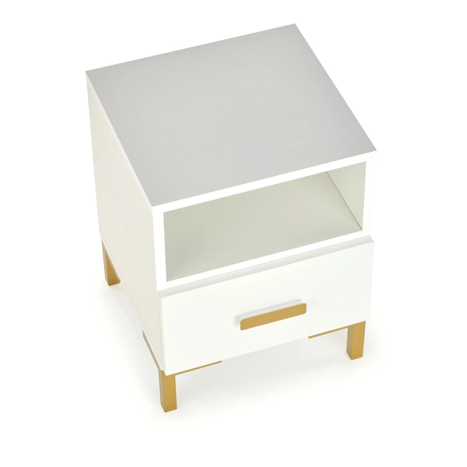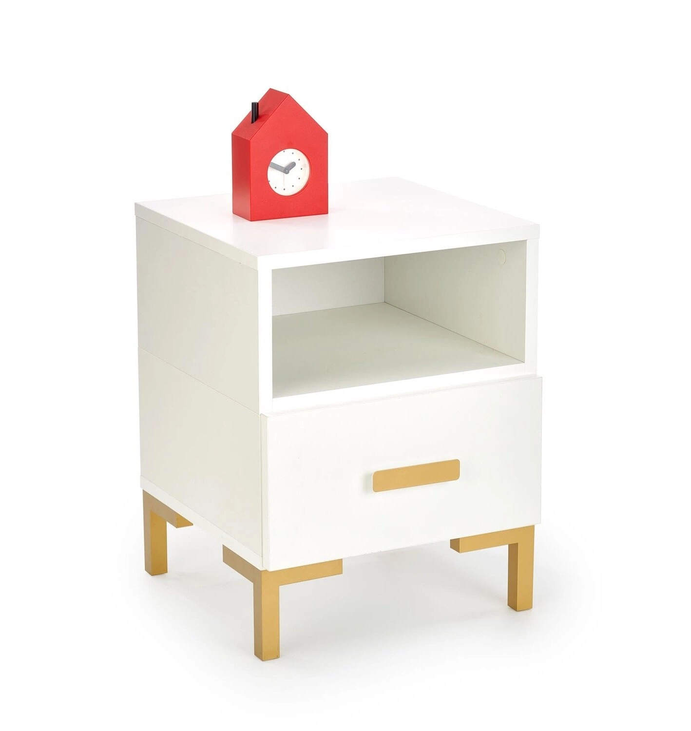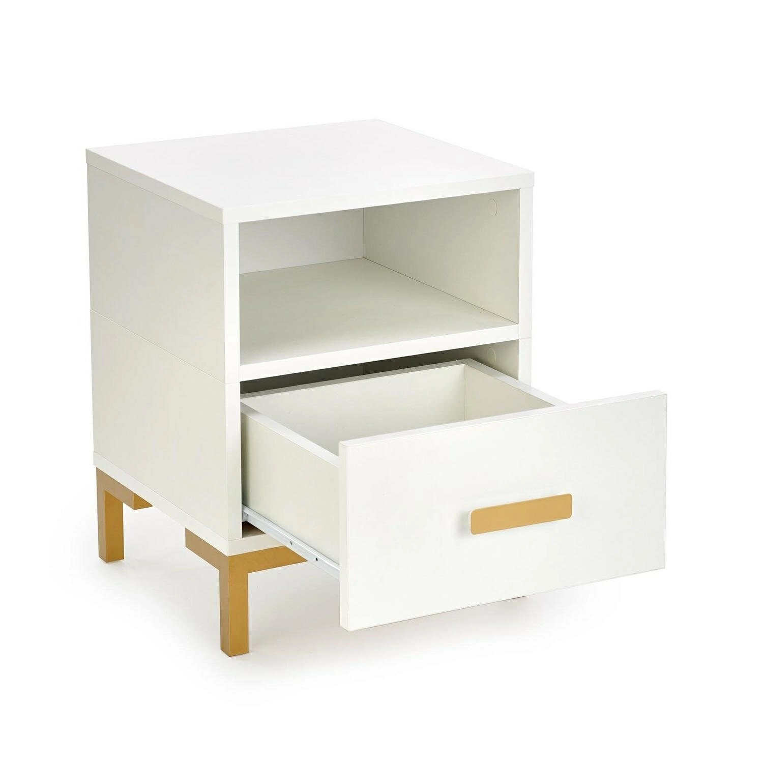 Moderní bílý noční stolek Tisaia od značky Intesi je harmonickým spojením minimalistického designu a praktičnosti. Tento stylový nábytek o rozměrech 40×40×52 cm je navržený s ohledem na ložnici i studentský pokoj, nabízí praktickou zásuvku na uložení drobností a jemné zlaté detaily. Hladká, polomatná čela a čtyři pevné nohy zajišťují, že stolek působí elegantně a zároveň nabízí každodenní stabilitu.