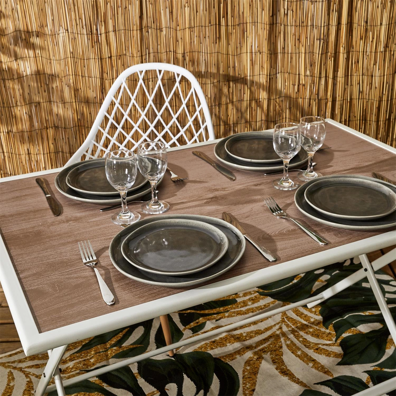 Stůl Barcelona je ztělesněním moderní estetiky – jednoduché linie a univerzální kombinace bílé s přírodními akcenty přesně odpovídají aktuálním trendům ve venkovním bydlení. Skleněná deska s dýhou napodobující dřevo působí nejen efektně, ale zároveň prosvětluje a opticky zvětšuje prostor. Minimalistický vzhled a čtyři štíhlé nohy v pololesklém provedení zajišťují, že stůl skvěle ladí s moderními i klasickými zahradními doplňky.