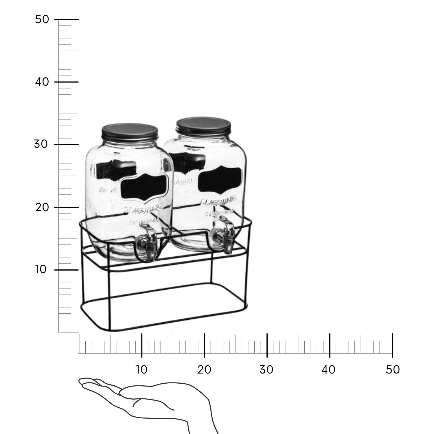 Sada skleněných nádob na nápoje s kohoutkem na stojanu značky 5five simply smart je nepostradatelným doplňkem každé úspěšné oslavy – přináší pohodlí, atraktivní vzhled a funkčnost, kterou ocení jak domácí, tak vaši hosté.