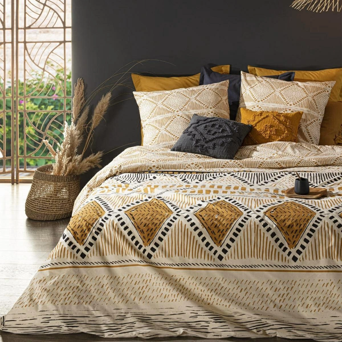 Výrazné černo-béžovo-žluté vzory inspirované orientálním uměním dodají interiéru jedinečný charakter a útulnou atmosféru. Pokud toužíte po ložnici s exotickým nádechem, povlečení Kilim se skvěle hodí jak do boho prostoru, tak do moderních interiérů, kde zvýrazní jejich osobitý styl. Díky originálnímu designu je povlečení nejen praktickým textilním doplňkem, ale i výraznou dekorací vaší ložnice.