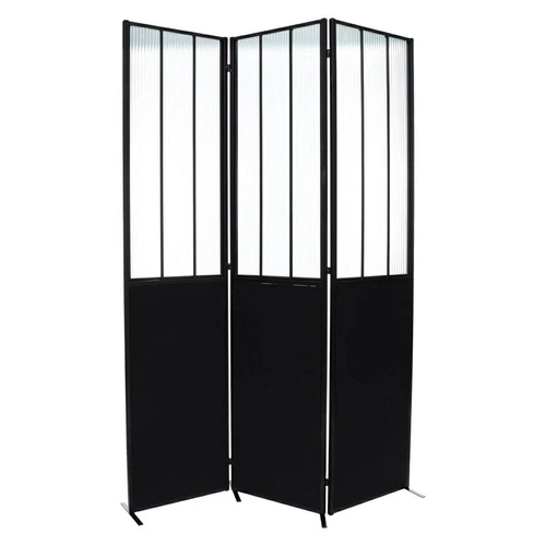 Loftová pokojová paravánová zástěna Atelier, 3dílná skládací, černá s tvrzeným sklem, 170 cm Atmosphera