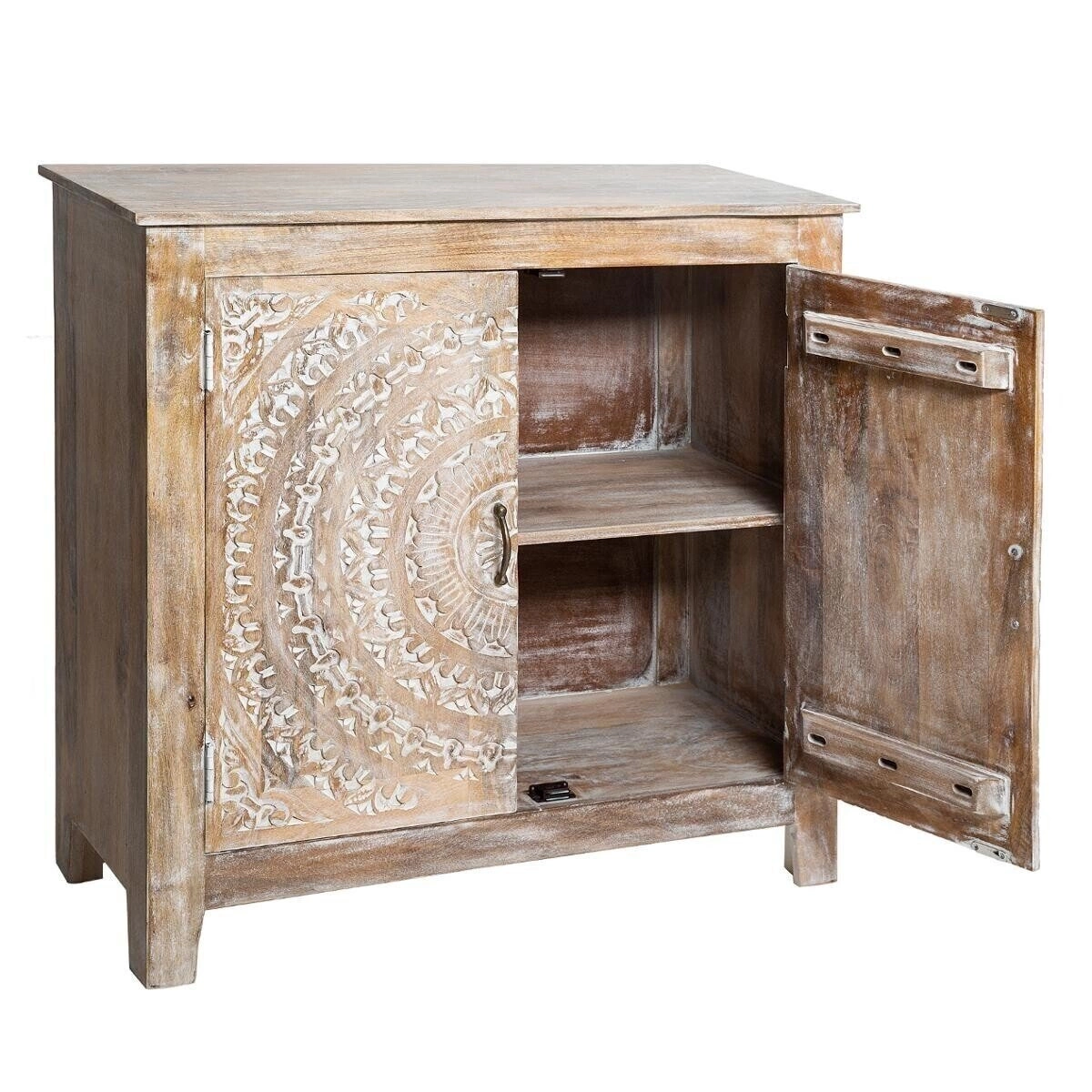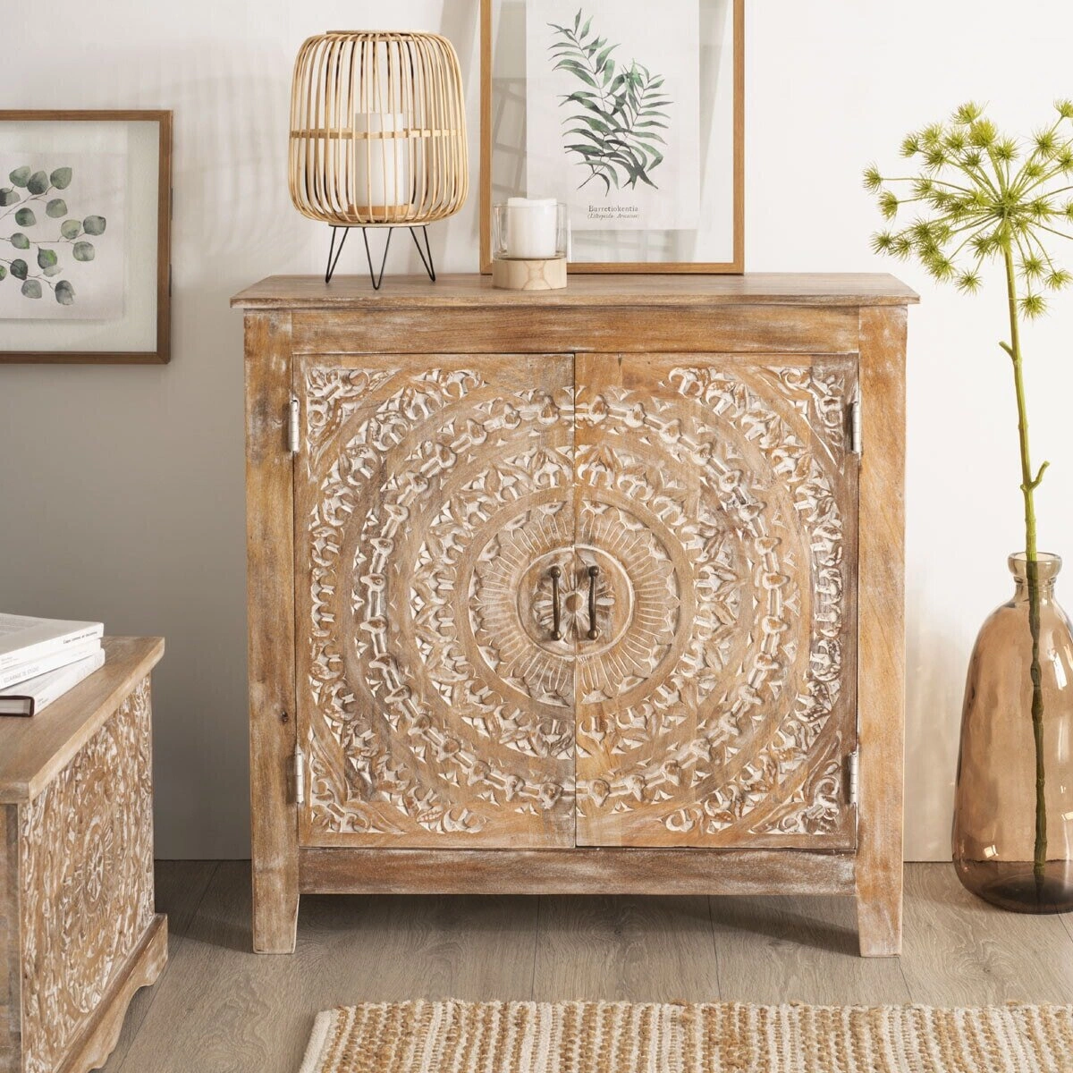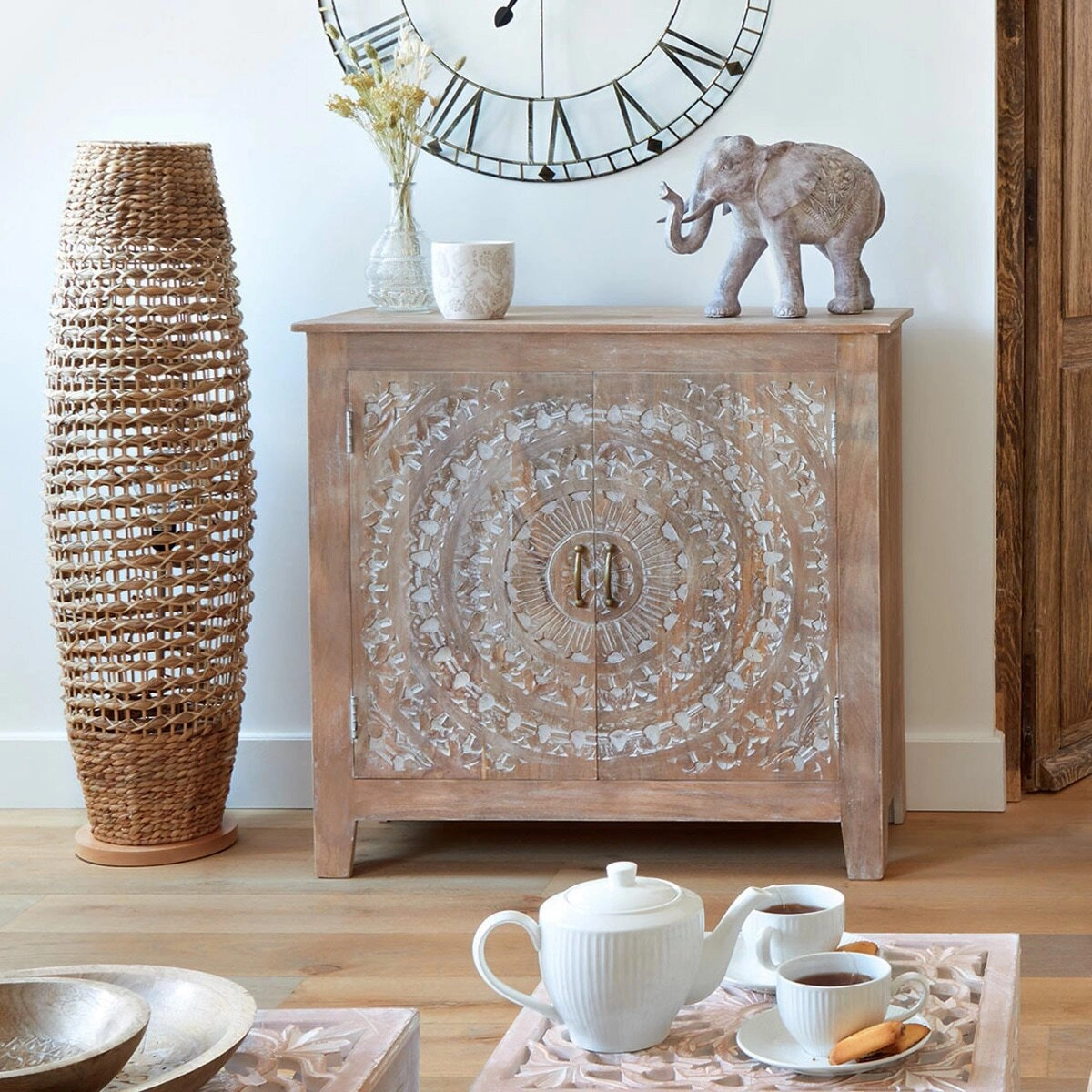 Shirel mango je dřevěná komoda, která upoutá pozornost detailně frézovaným čelem inspirovaným orientálními motivy. Reliéfní zdobení jemně odráží světlo a podtrhuje jedinečný charakter tohoto nábytku. Přírodní bělená povrchová úprava zajišťuje, že komoda skvěle vynikne jak ve světlých, minimalistických interiérech, tak v barevných nebo rostlinných aranžmá. Je to ideální volba pro ty, kteří hledají originální a zároveň nadčasové řešení do obýváku, ložnice, pracovny nebo jídelny.