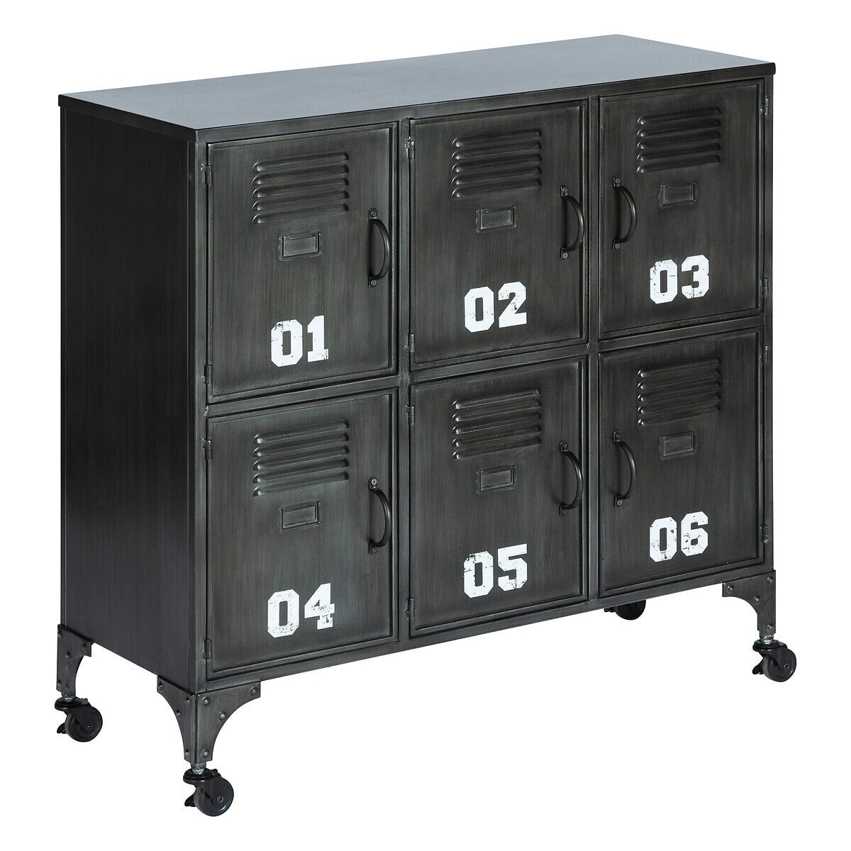Díky šesti uzavíratelným skříňkám nabízí industriální komoda Sevin pohodlné a bezpečné uložení všech potřebných věcí – od textilu, přes dokumenty až po elektroniku. Výška 88,5 cm a hloubka 35 cm umožňují umístit nábytek i do užších prostor, jako je předsíň nebo kancelář. Praktická kolečka zajišťují snadné přesouvání, což oceníte například při úklidu nebo změně uspořádání místnosti.