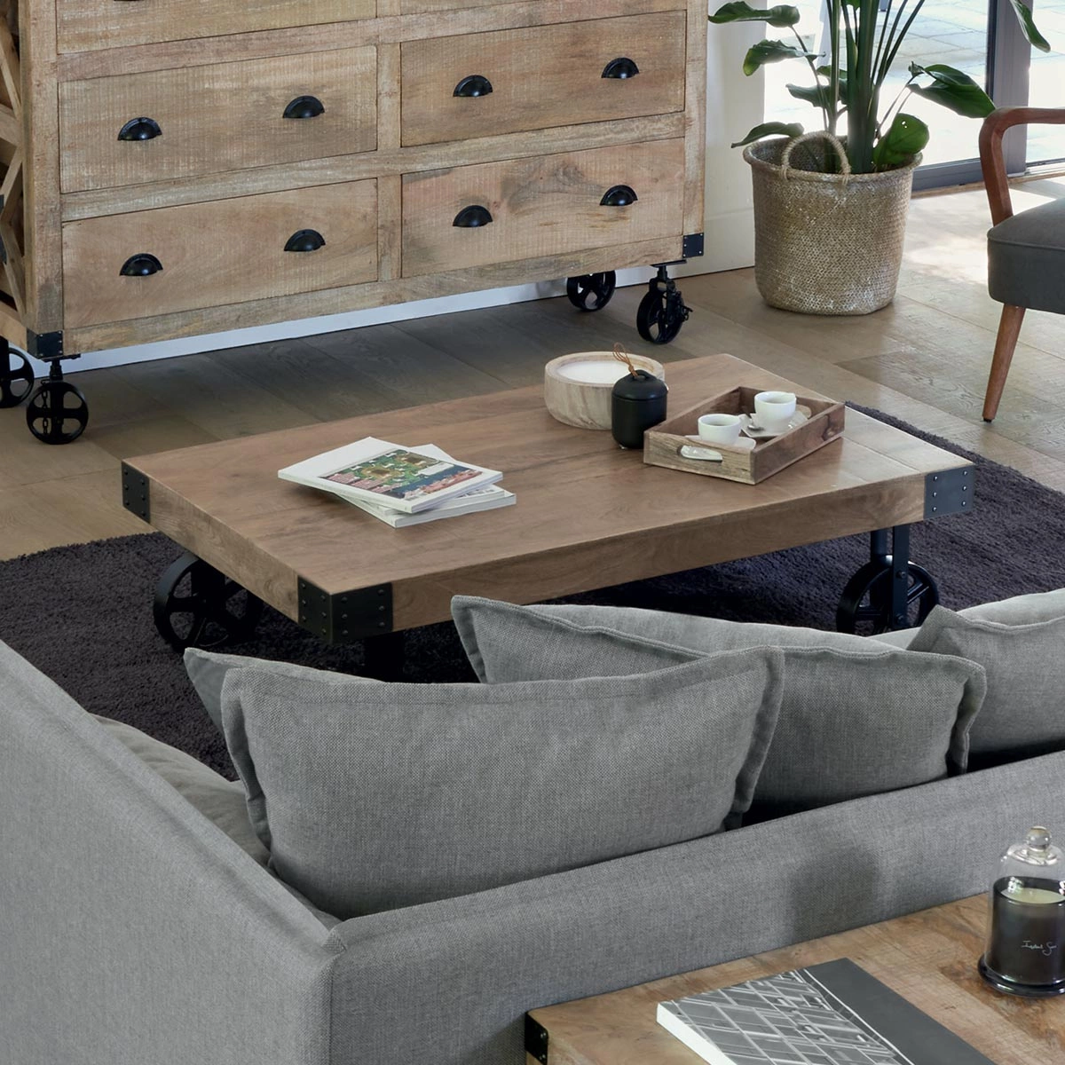 Konferenční stolek Silas mango obdélníkový loftový dřevěný na kolečkách do obýváku 117 cm Atmosphera – styl a pohodlí ve vašem obývacím pokoji