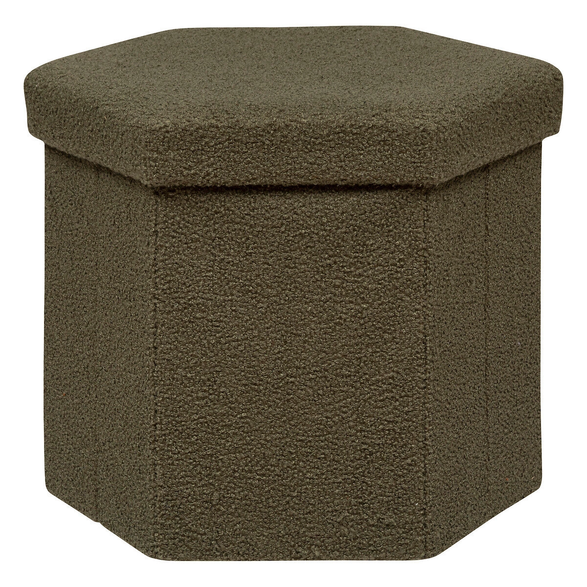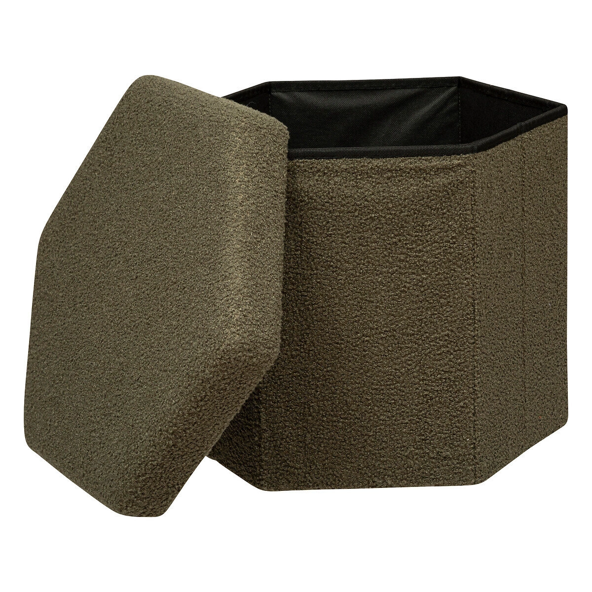 Pufa Jaiko boucle khaki od značky Atmosphera je moderní, šestihranný čalouněný taburet potažený módní a příjemnou látkou bouclé. Nabízí praktické řešení 2v1 – pohodlné sezení a zároveň prostorný úložný box o objemu až 72 litrů, takže se skvěle hodí do obývacího pokoje, ložnice, šatny nebo předsíně. Tento model lze jednoduše složit a ušetřit tak místo, zatímco kompaktní rozměry (výška 38 cm, šířka 40 cm, hloubka 40 cm) umožňují pohodlné umístění i v menších místnostech.