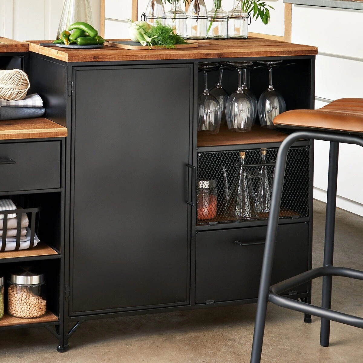 Komoda Cierna je mimořádně praktický kus nábytku, který vyniká svým originálním stylem. Na levé straně se nacházejí masivní dvířka, za nimiž se skrývají tři úložné prostory. Na pravé straně má komoda otevřenou niku s věšáky na skleničky na víno a dvě mušlové zásuvky, jednu s plnými dvířky a druhou se síťovanými dvířky. Nádobí tak bude vždy řádně uspořádané a po ruce. Komoda Cierna je kus nábytku plný překvapení, který vás rozhodně nebude nudit