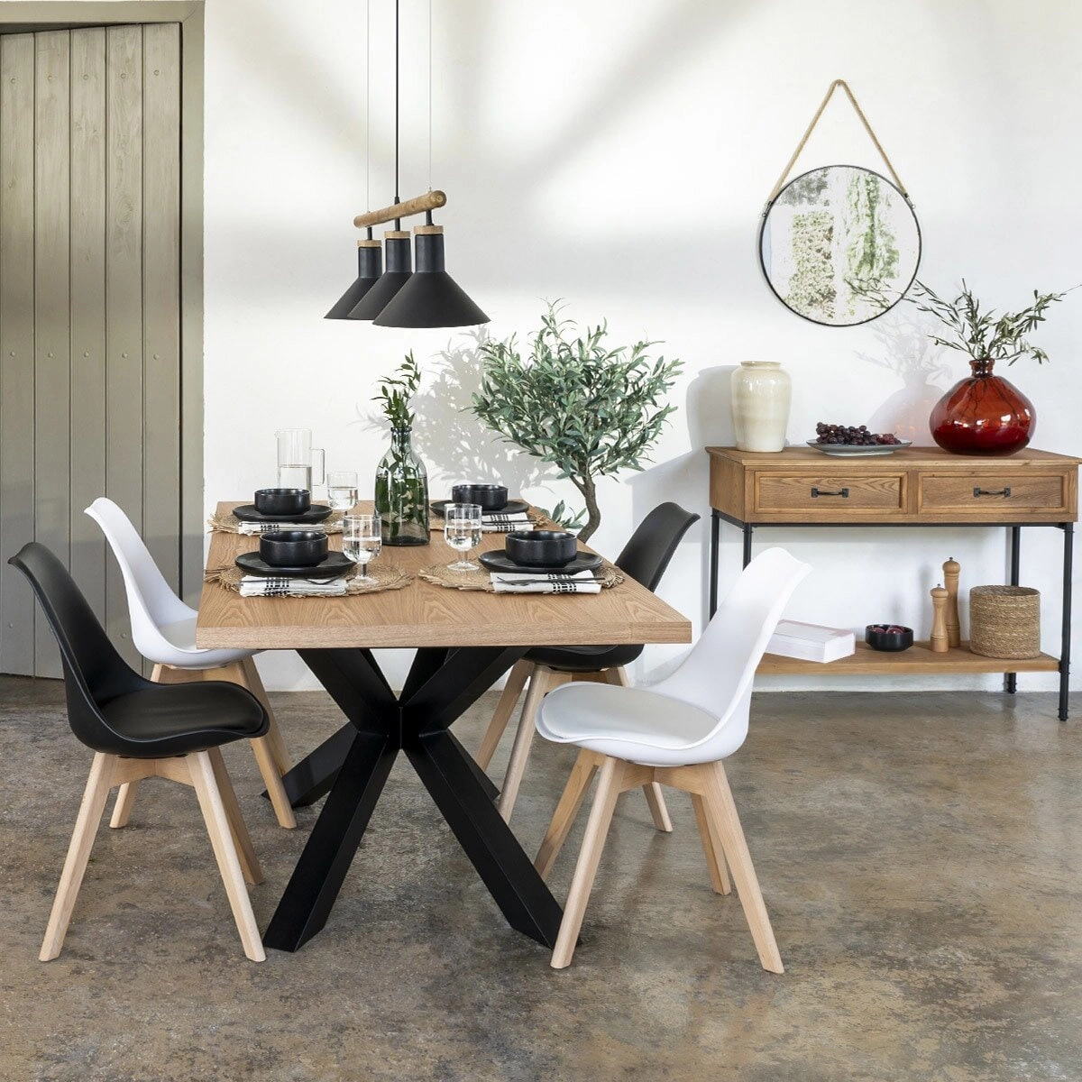 Konzole Danik od značky Atmosphera je rustikální příruční stolek o šířce 110 cm, vyrobený z odolné dřevovláknité desky a postavený na pevné, kovové konstrukci. Čelní strana s jemnými dekorativními prvky a kombinace přírodního povrchu s černými nohami dává nábytku výrazný vzhled a přináší do interiéru útulnou, venkovskou atmosféru. Konzole s praktickými zásuvkami a policí nabízí dostatek prostoru na drobnosti a skvěle poslouží jako konzolový stolek do předsíně, ložnice i obývacího pokoje.