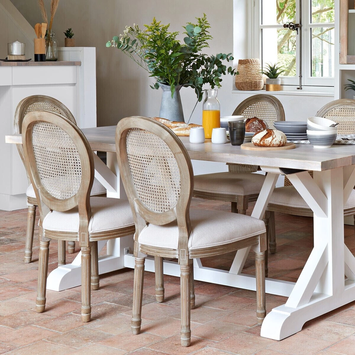 Čalouněná židle Cleon od značky Atmosphera představuje dokonalé spojení přírodních materiálů, pohodlí a jedinečného boho stylu. Vysoké, štíhlé nohy z kaučukového dřeva v přírodním odstínu zajišťují stabilitu, zatímco béžový sedák potažený měkkou tkaninou a opěrka zdobená dekorativním ratanem poskytují maximální komfort při každodenním stolování či posezení u stolu. Díky výšce 95,5 cm a šířce 55,5 cm se tento model skvěle hodí jako jídelní židle, do kuchyně nebo elegantního obývacího pokoje.