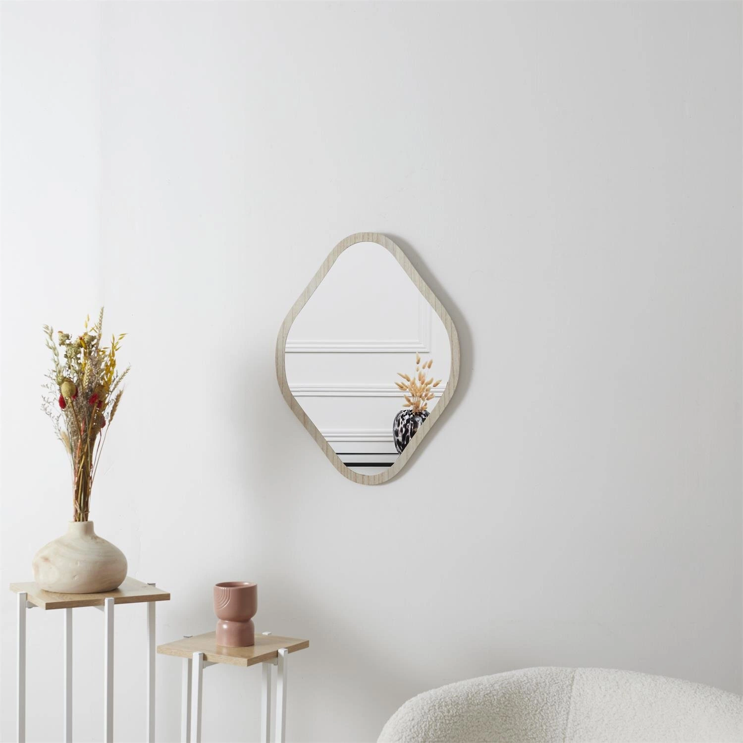 Vneste do svého interiérumoderní eleganci se zrcadlem Diamond, které spojuje výjimečný design s funkčností. Jeho neobvyklý tvar přitahuje pozornost a je atraktivním dekorativním prvkem, který se může stát ústředním bodem každé místnosti.sk.Subtilní rám v přírodním odstínu dřeva dodává teplo a harmonii a jeho elegantní vzhled dokonale ladí a s různými designovými styly - moderními i klasickými.