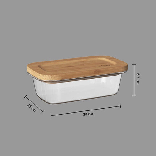 Víko vyrobené z přírodního bambusu dodává dóze moderní, ekologický vzhled a zároveň zajišťuje vzduchotěsnost, která pomáhá udržet uložené potraviny čerstvé. Skleněný box je kompatibilní s mikrovlnnou troubou, myčkou nádobí i klasickou troubou (bez víka), což z něj činí mimořádně všestranný nástroj v kuchyni. Díky svému obdélníkovému tvaru se dóza snadno ukládá do lednice nebo kuchyňských skříněk, čímž šetří místo.