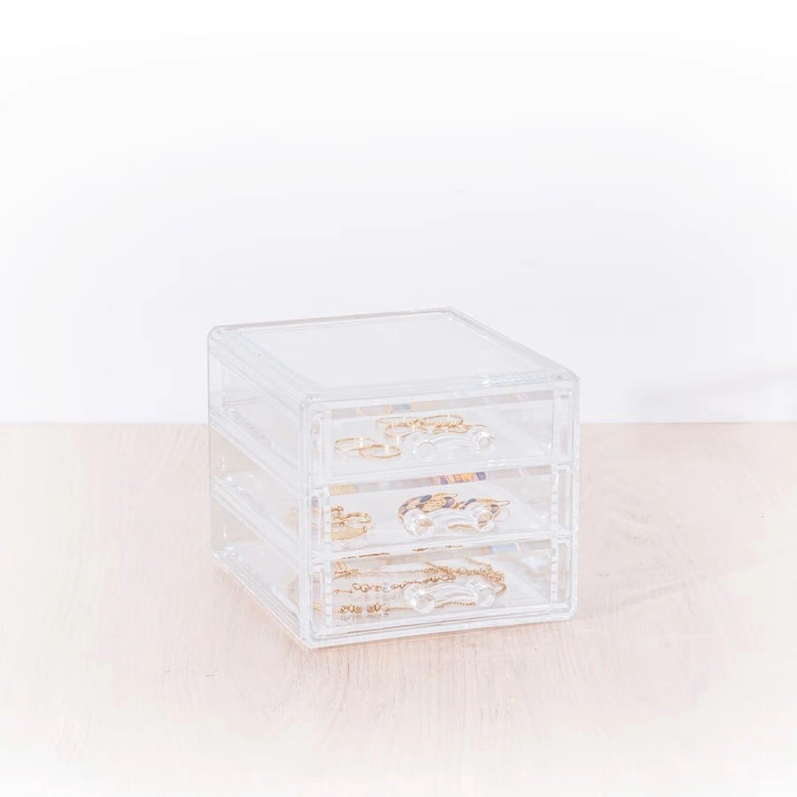 Organizer na šperky Selena transparentní se 3 zásuvkami je praktické a stylové řešení pro všechny, kteří chtějí mít své doplňky přehledně uložené a vnést pořádek do každodenní péče o sebe.
