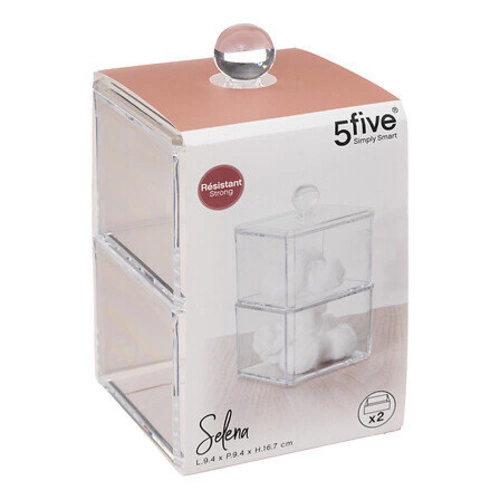Selena organizer na kosmetiku transparentní s víkem od značky 5five simply smart je čtvercová úložná krabička vyrobená z odolného, průhledného polystyrenu. Díky kompaktním rozměrům (výška 16,7 cm, šířka a hloubka 9,4 cm) a pevnému víku se skvěle hodí na toaletní stolek, do koupelny, šatny nebo na pracovní stůl. Průhledný design umožňuje snadnou kontrolu obsahu a minimalistický vzhled dokonale ladí s moderním a elegantním interiérem.