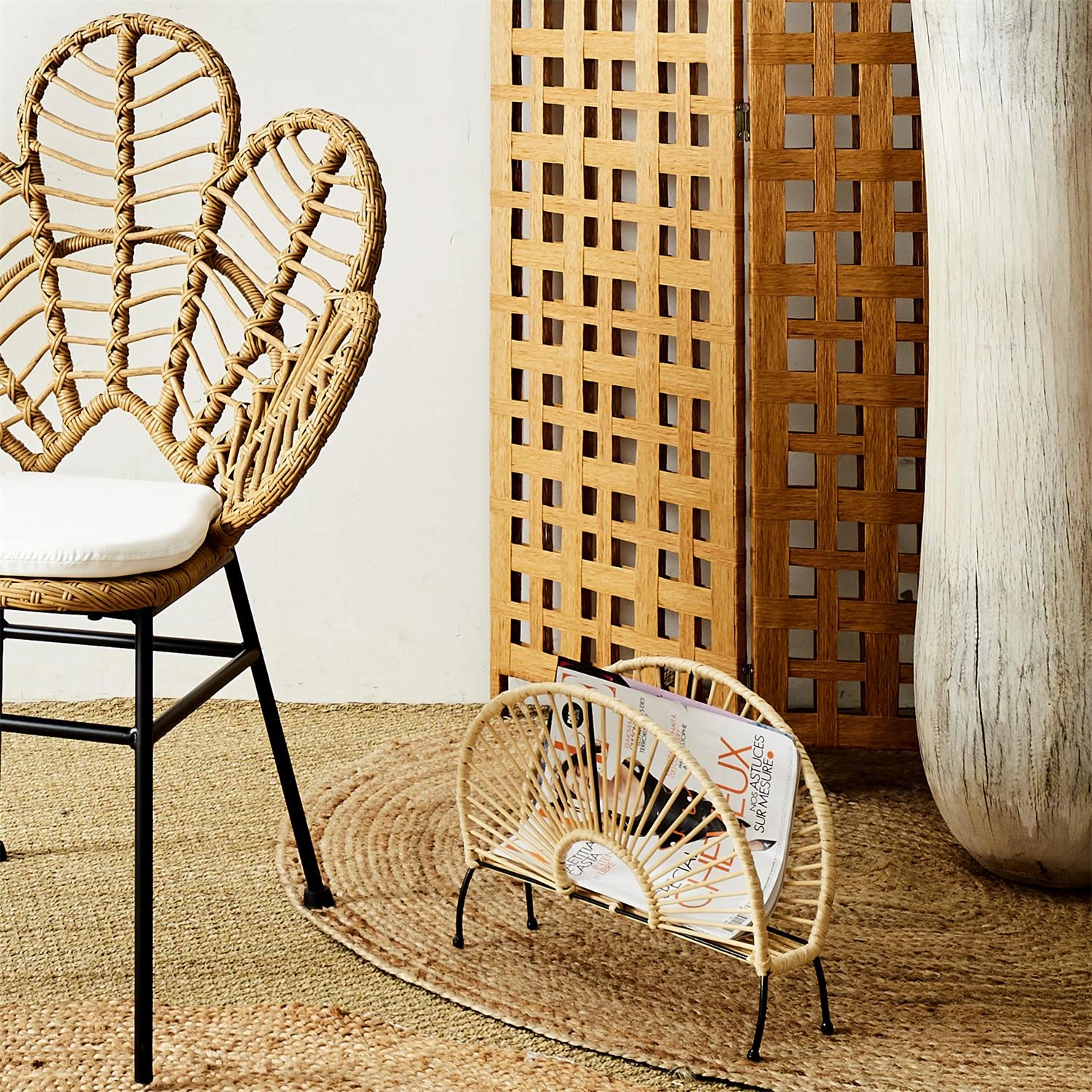 Držák na noviny Fogler s ratanovým efektem je elegantní a funkční doplněk, který vnese do každého interiéru estetiku i pořádek. Jeho design čerpá z tradičního vzoru pleteného ratanu, což mu dodává klasické kouzlo a činí z něj dokonalý dekorativní kousek. Skvěle se bude hodit do obývacího pokoje, kanceláře, ložnice nebo čekárny a vnese do moderního uspořádání nádech rustikálního stylu.