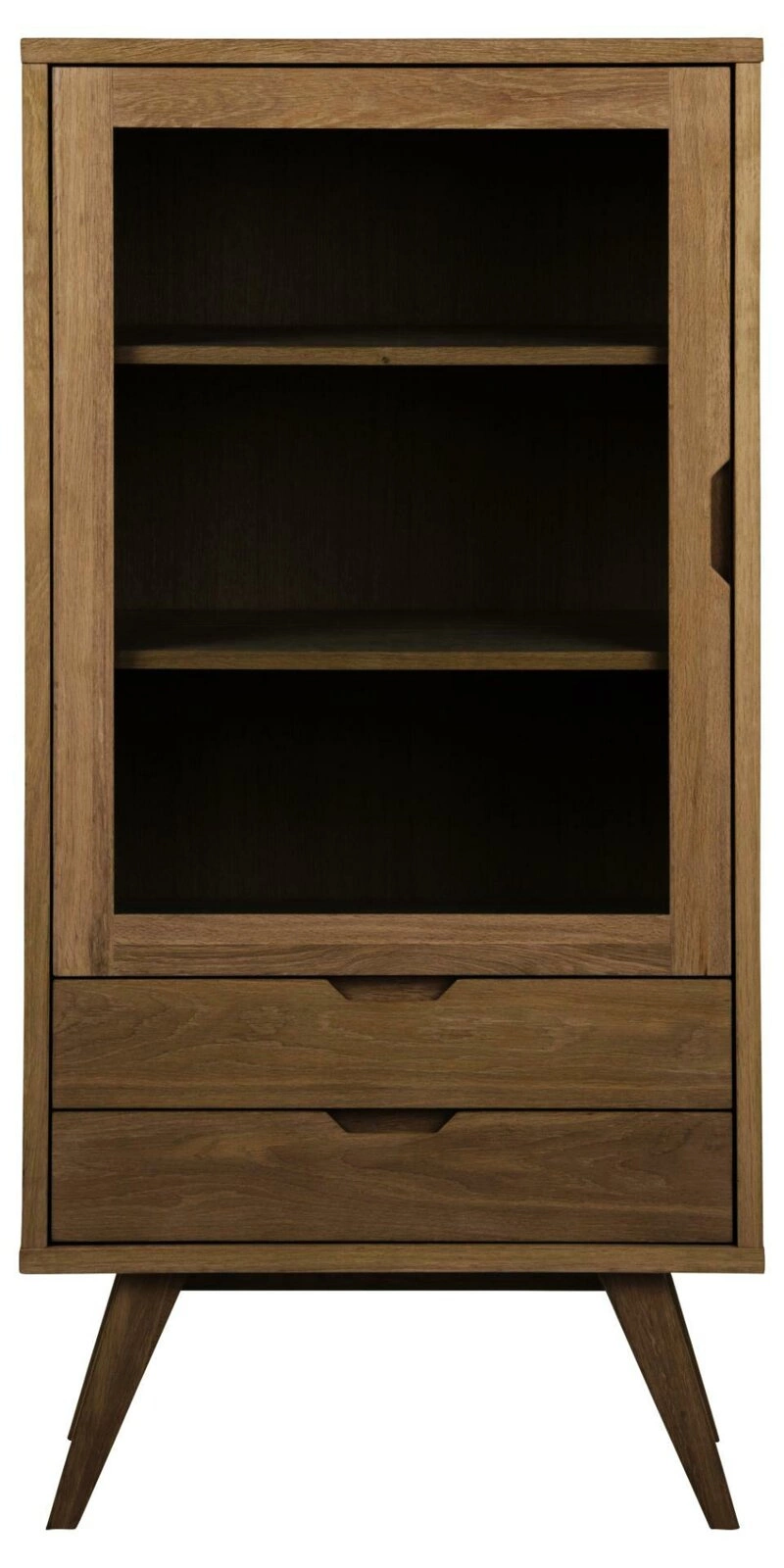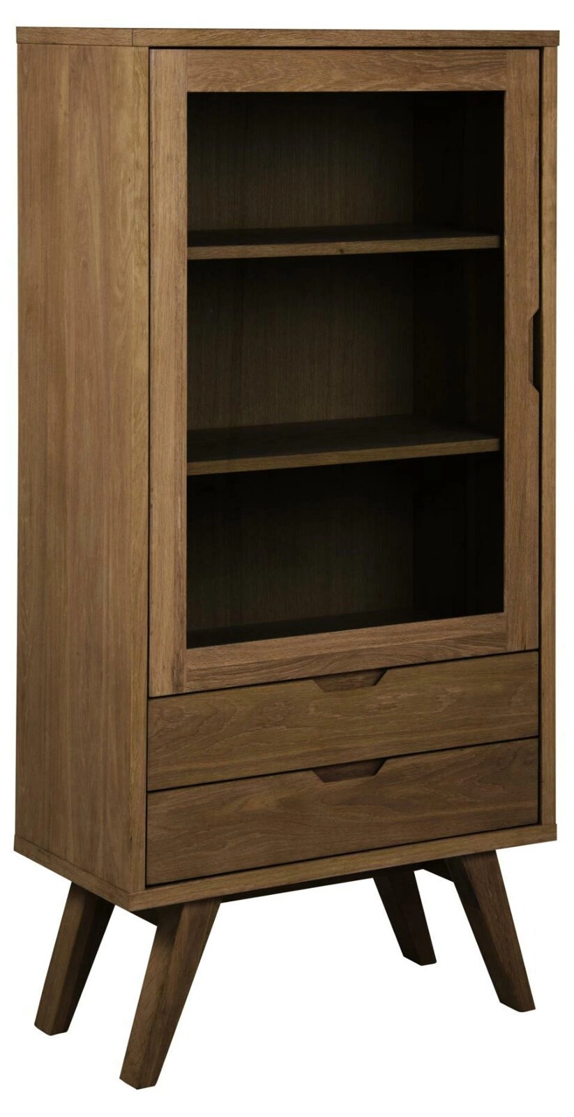 Díky promyšlenému vnitřnímu rozložení – jedné uzavíratelné skříňce a dvěma prostorným policím – umožňuje vitrína pohodlné uložení i atraktivní vystavení předmětů. Maximální nosnost polic až 17 kg dovoluje umístit i těžší knihy či sbírky porcelánu. Matná povrchová úprava dubové dýhy nejen podtrhuje její přirozený odstín, ale také usnadňuje každodenní údržbu nábytku v čistotě.