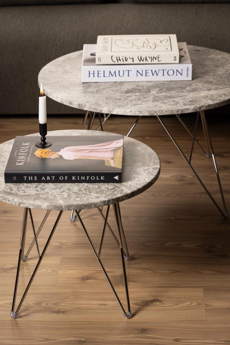 Prunus není jen moderní kávový stolek, ale také praktický konferenční stolek do obýváku, který spojuje eleganci glamour s jednoduchostí loftového stylu. Kulatá deska ze šedého mramoru dokonale ladí jak se skandinávským, tak minimalistickým interiérem. Přírodní struktura kamene zajišťuje, že každý kus je originální a podtrhne prestiž vašeho domova. Chromovaná, lesklá konstrukce zaručuje stabilitu a upoutá pozornost svým sofistikovaným zpracováním.Funkčnost a snadná údržba v každodenním používání